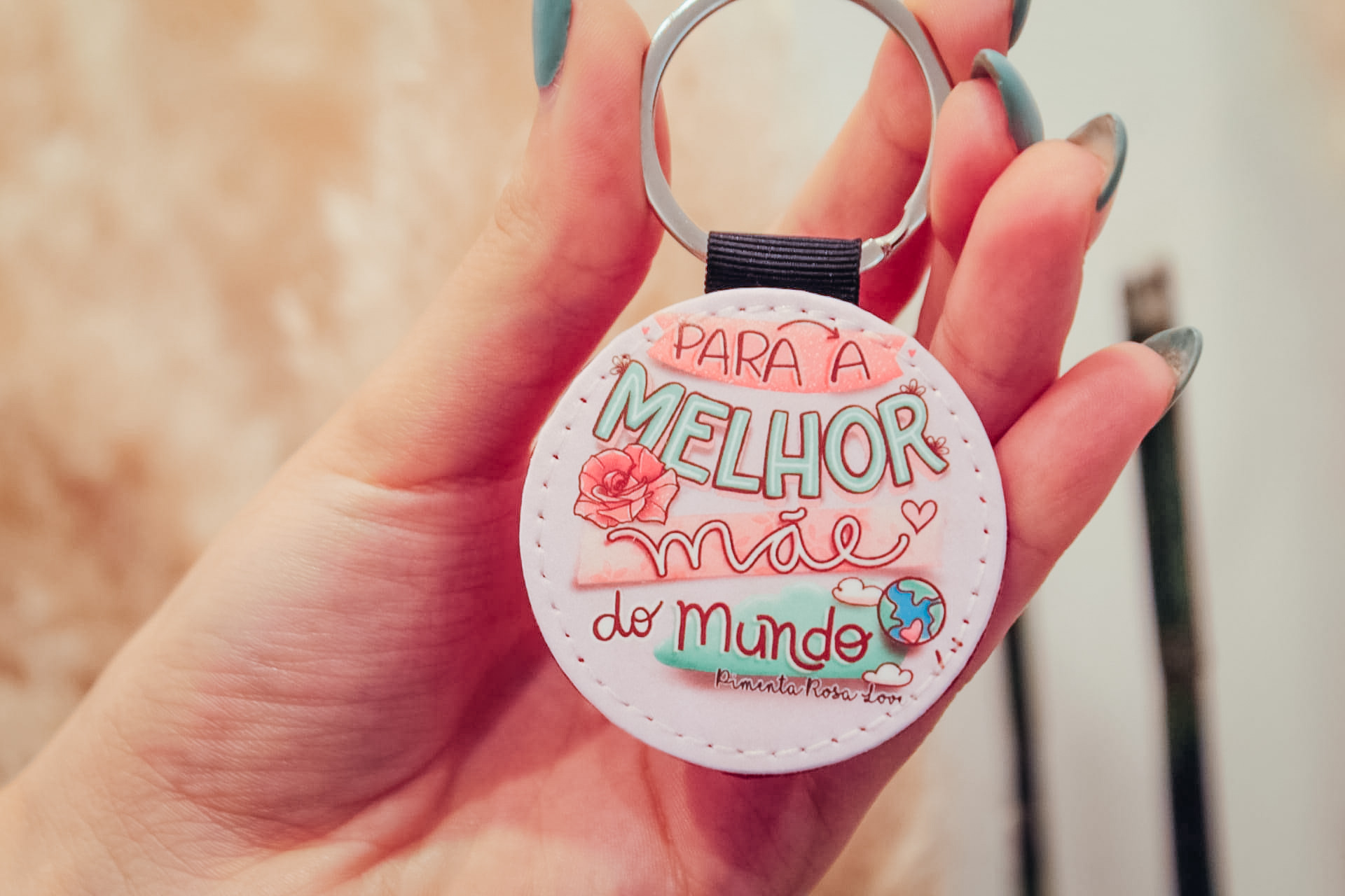 • Porta-chaves redondo com texto 'PARA A MELHOR mãe do mundo' e desenhos coloridos