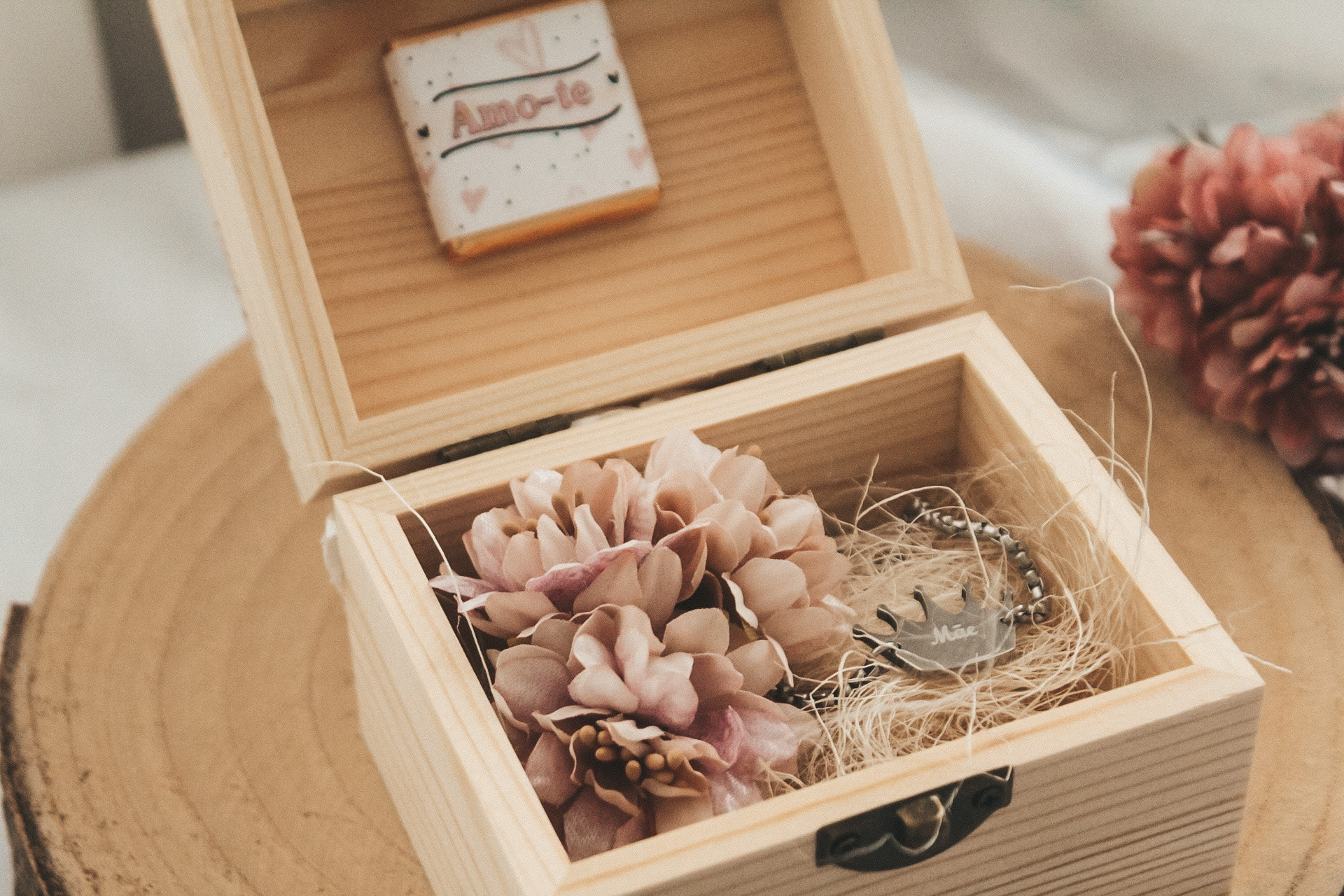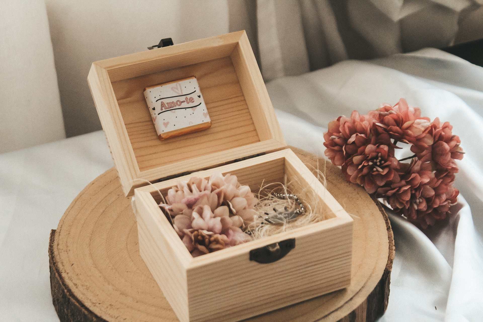 • caixa de madeira clara aberta com flores artificiais e colar dentro