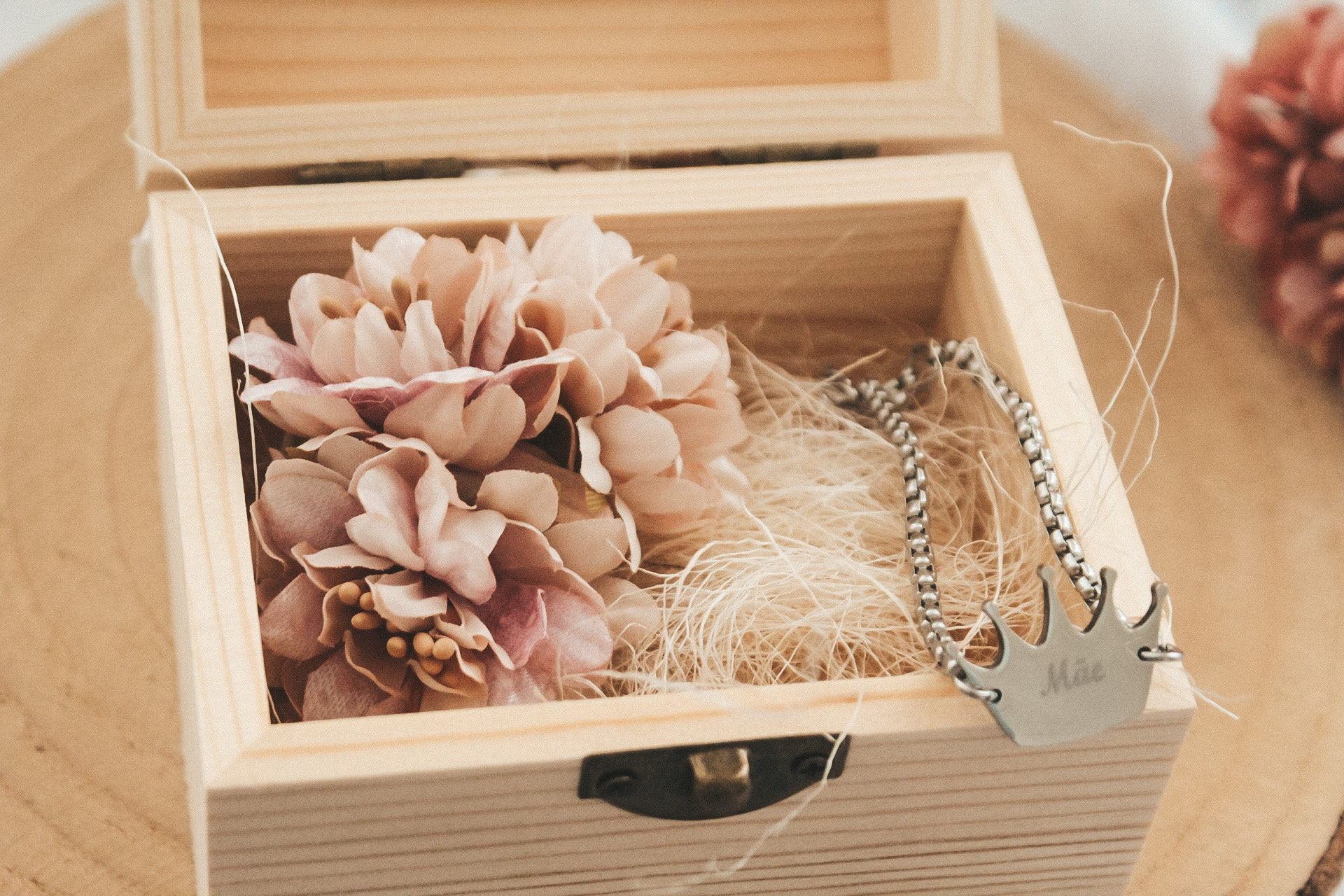 • Caixa de madeira com flor decorativa rosa e colar prateado com pendente em forma de coroa