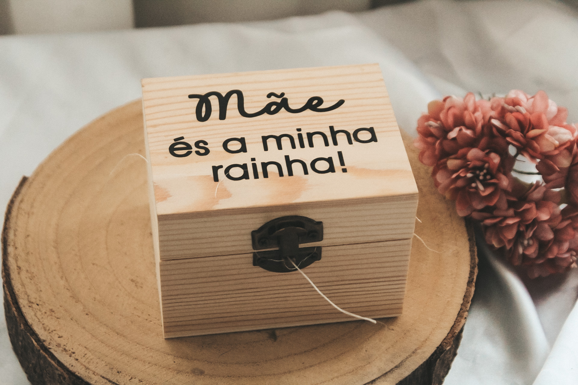 • Caixa de madeira clara gravada com texto sobre tronco de madeira e flores cor de rosa