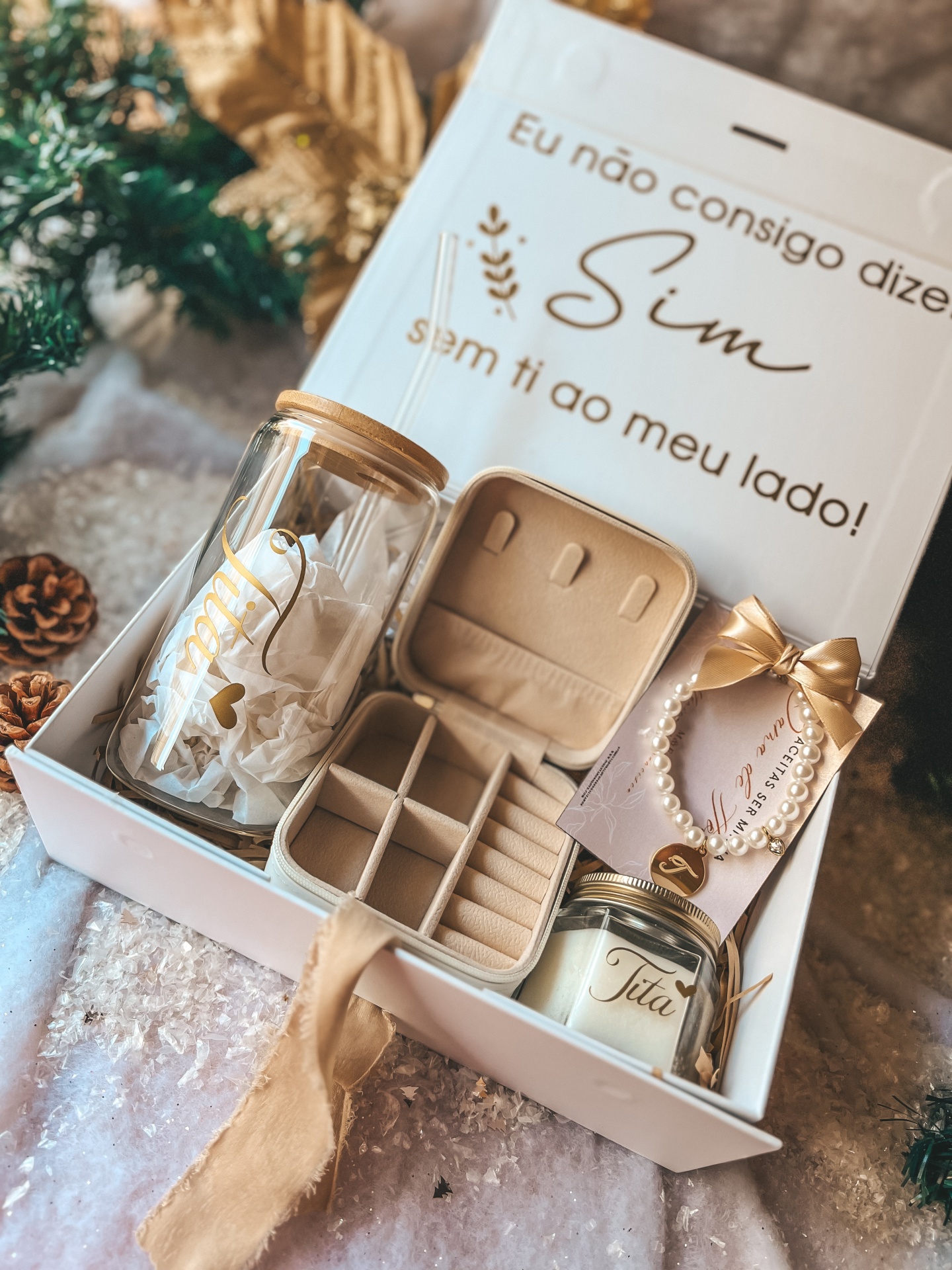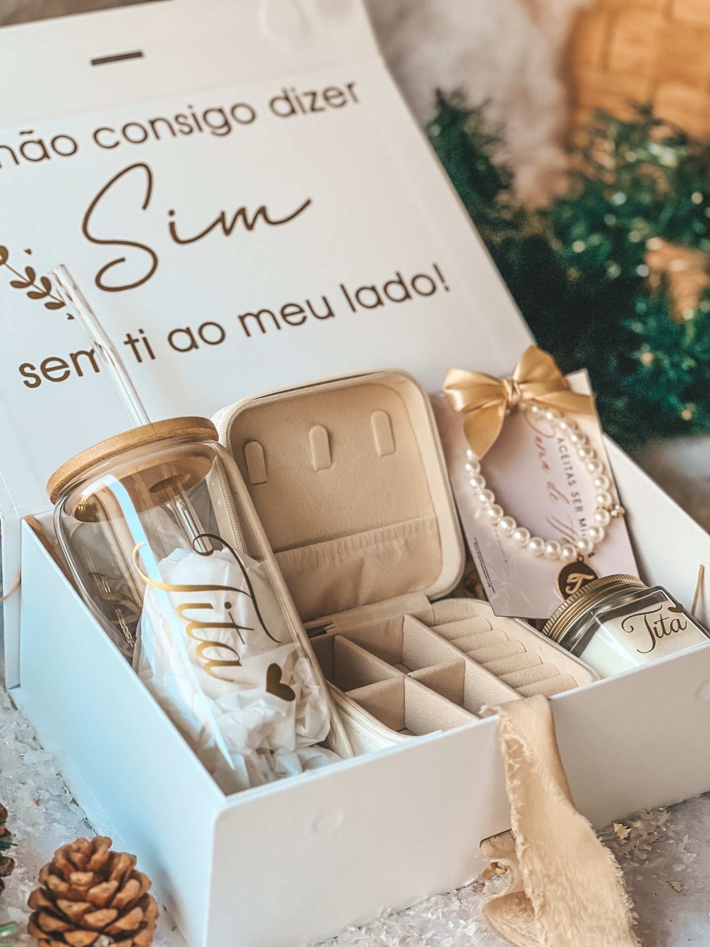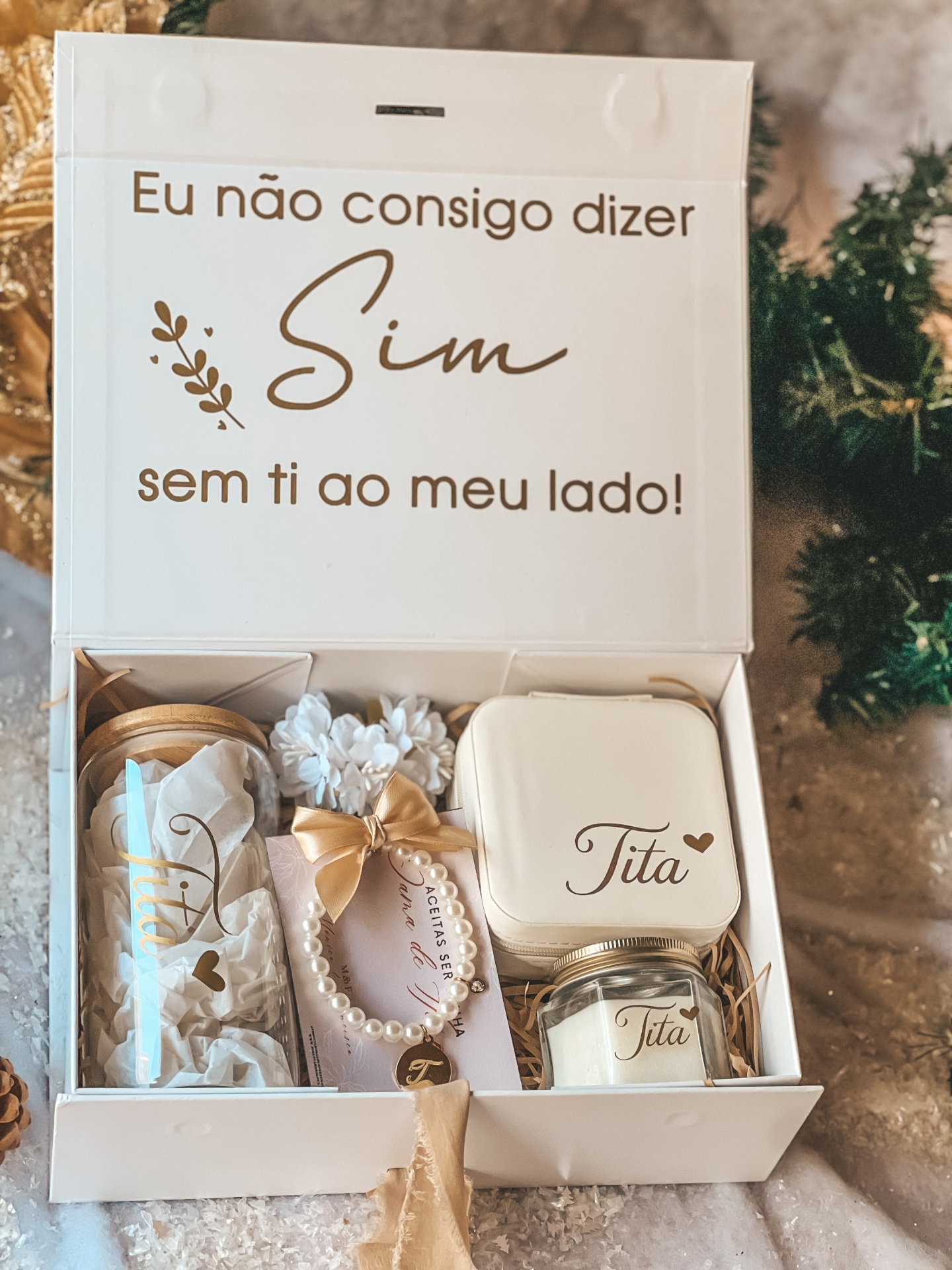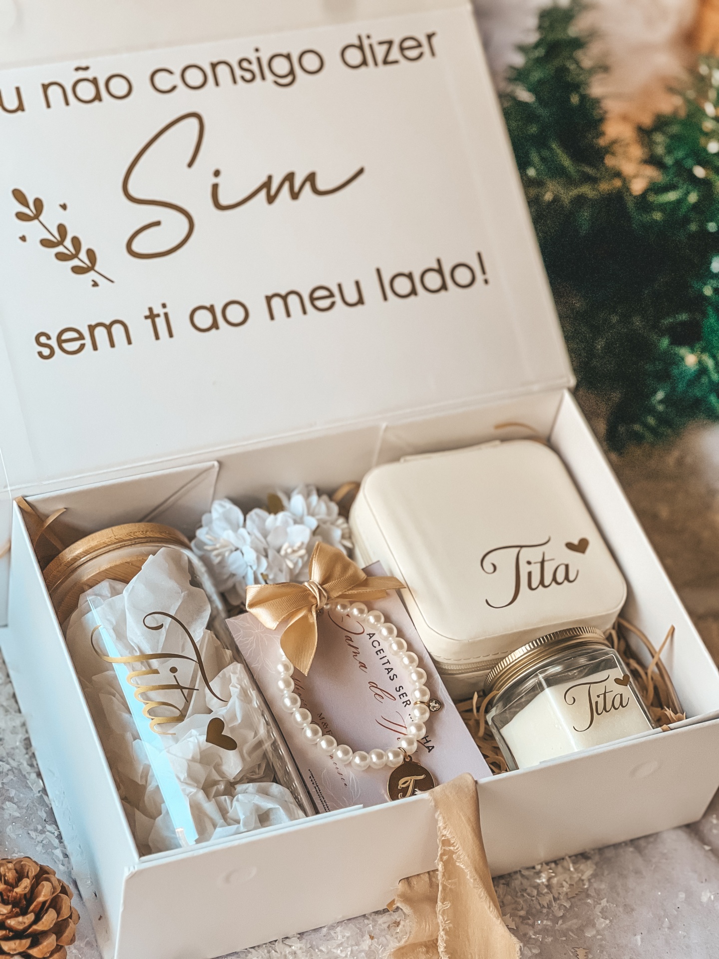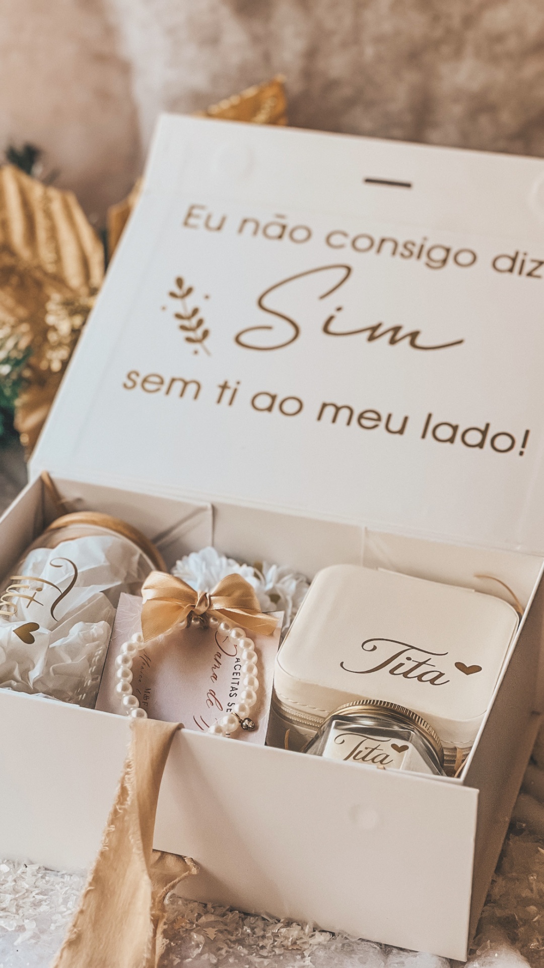 • Caixa de presente branca com itens personalizados com texto 'Tita'
