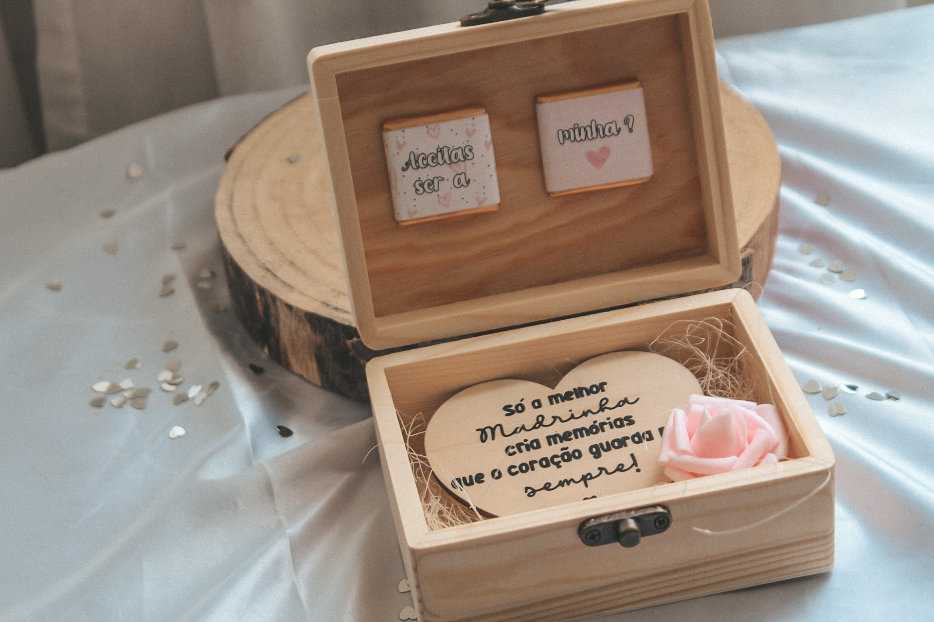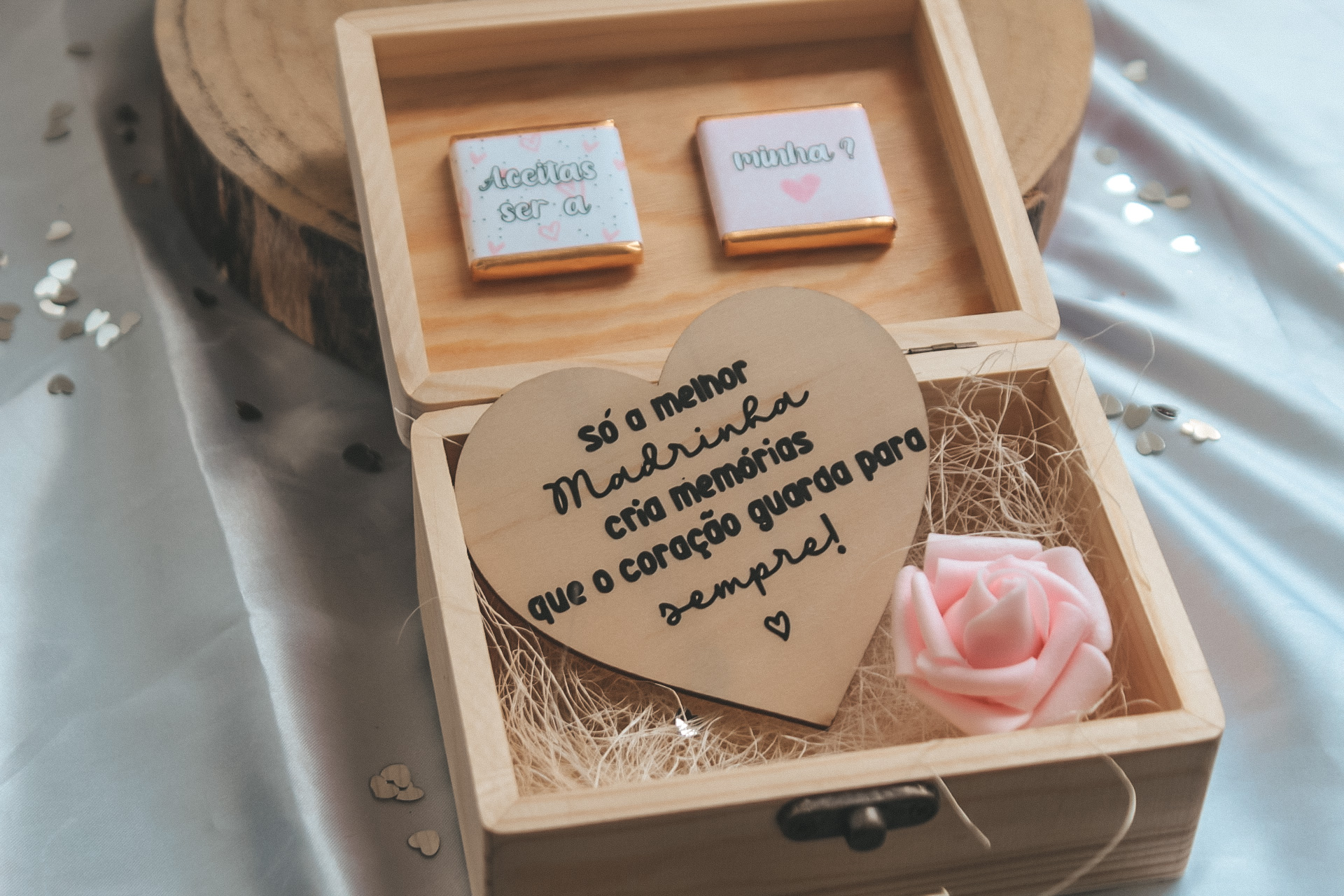 • Caixa de madeira com pedra decorativa e texto, decorada com saquinho rosa, sobre tecido prateado