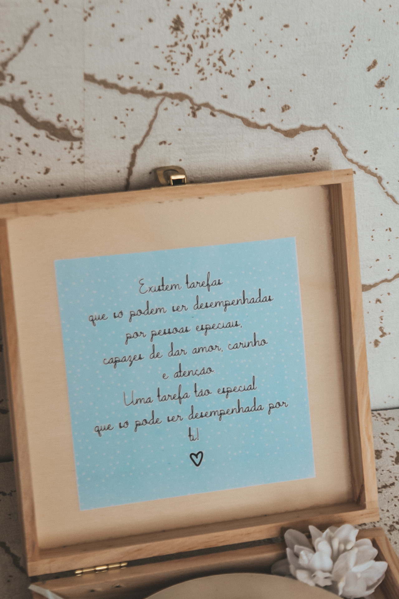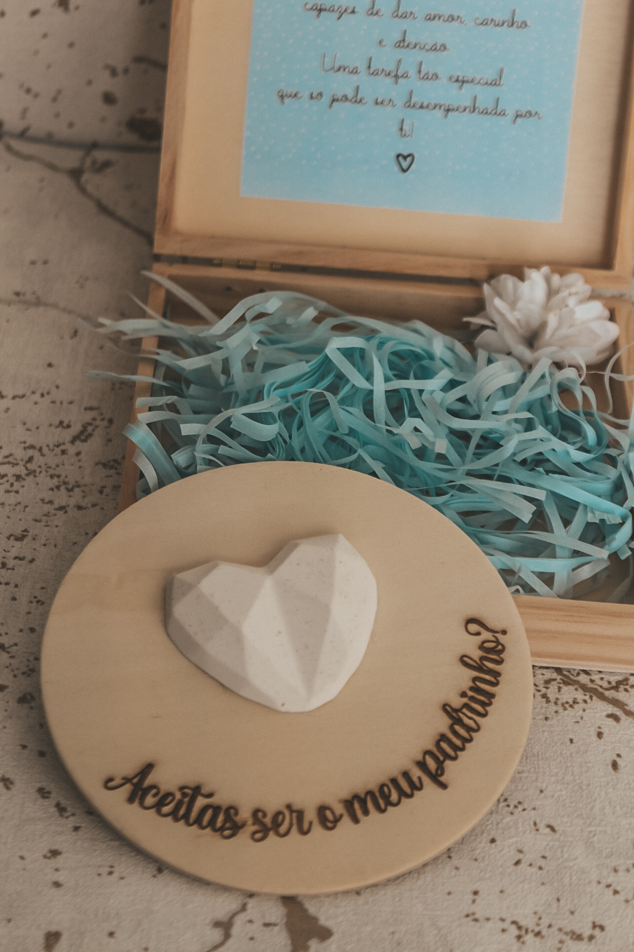 • Placa de madeira com coração branco e frase gravada dentro de uma caixa aberta com papel azul e cartão.