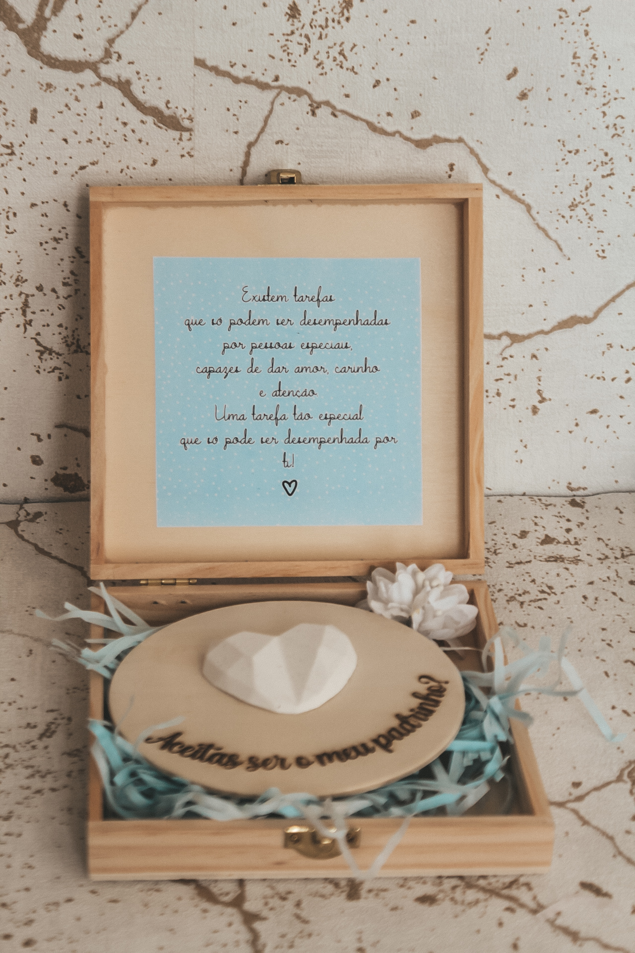 • Caixa de madeira com pedra em forma de coração e mensagem para padrinho
