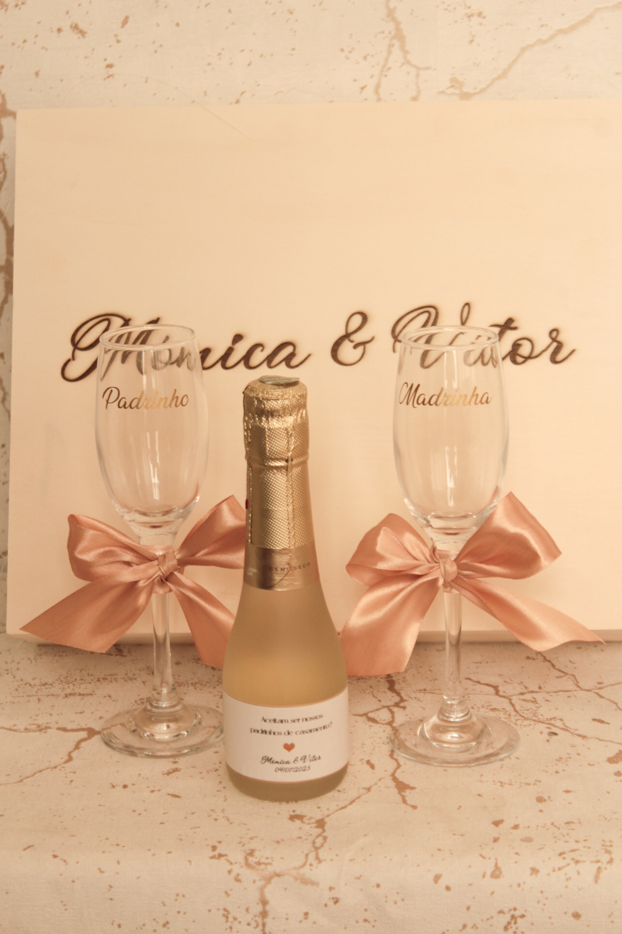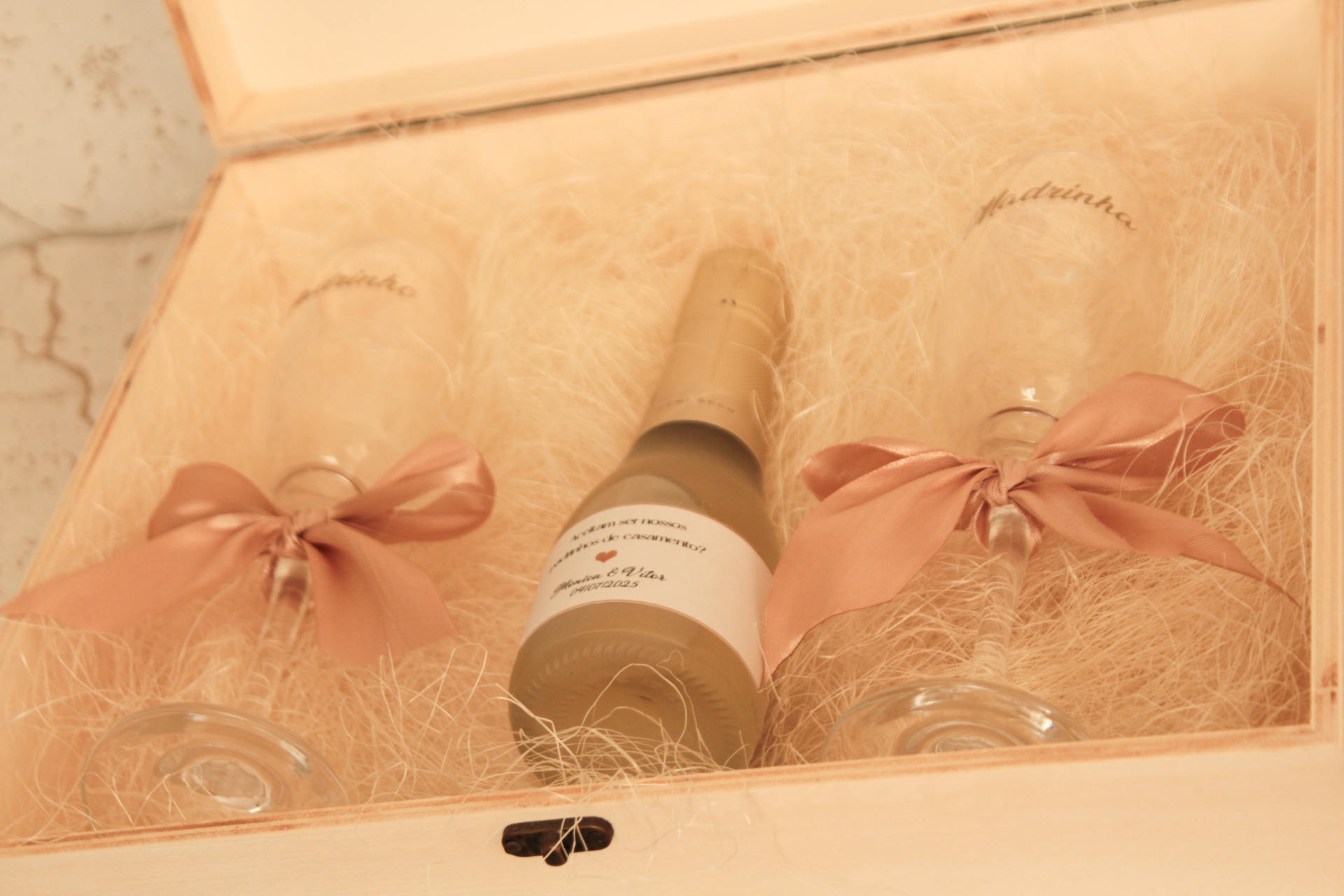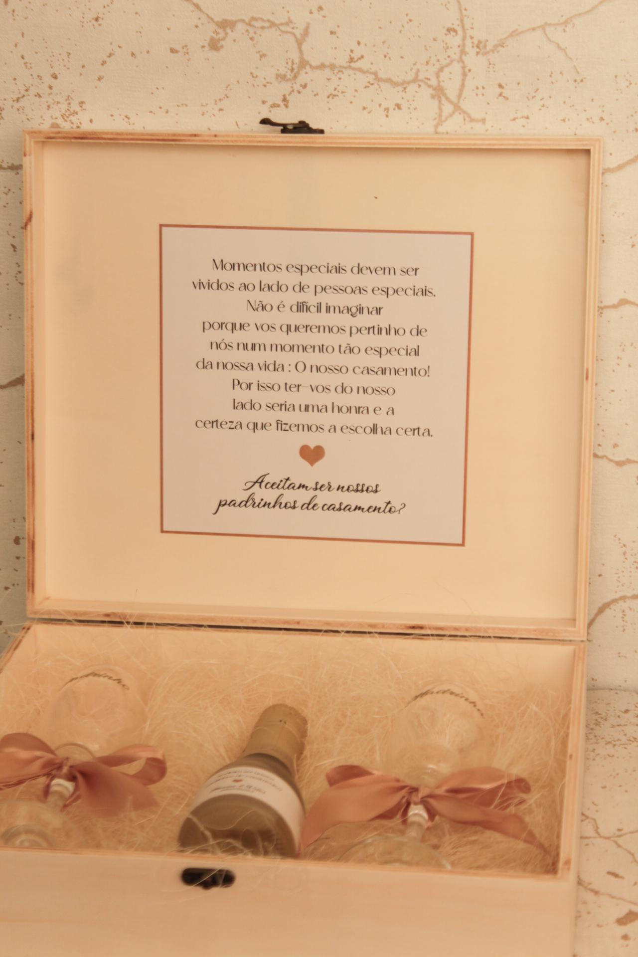 • Caixa de madeira com champanhe, dois copos com laços cor de rosa e mensagem em português para padrinhos de casamento
