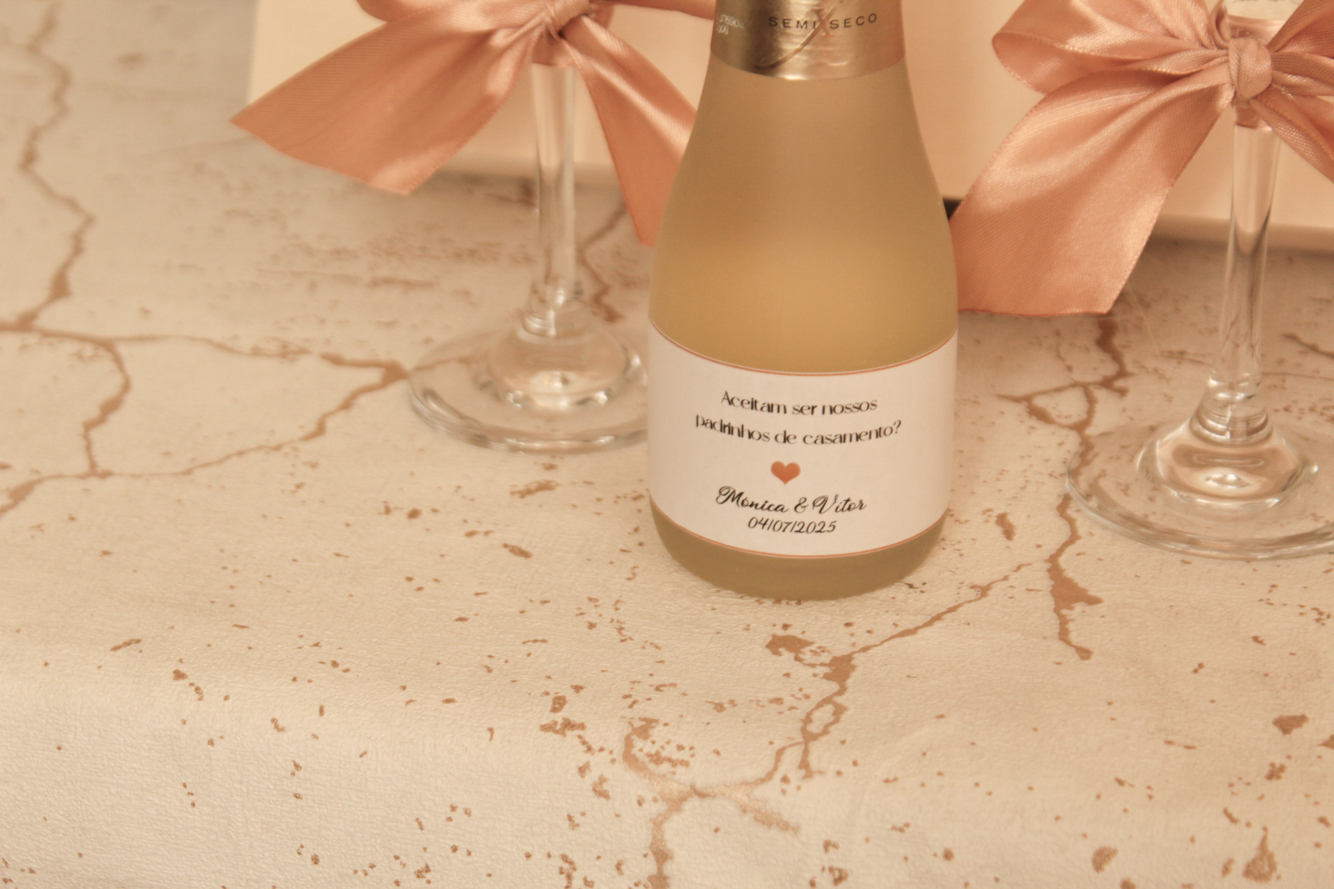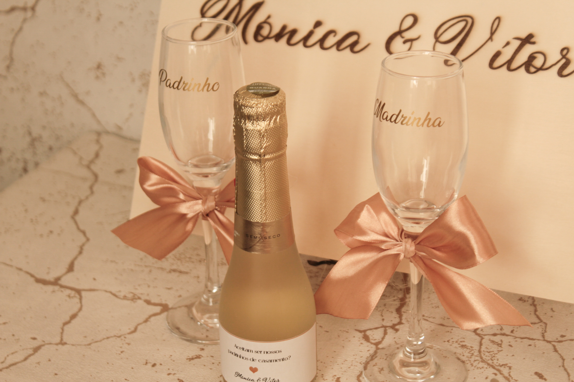 • Duas flutes de champanhe com laços cor-de-rosa e texto 'Padrinho' e 'Madrinha', pequena garrafa de champanhe e fundo com texto 'Mónica & Vítor'