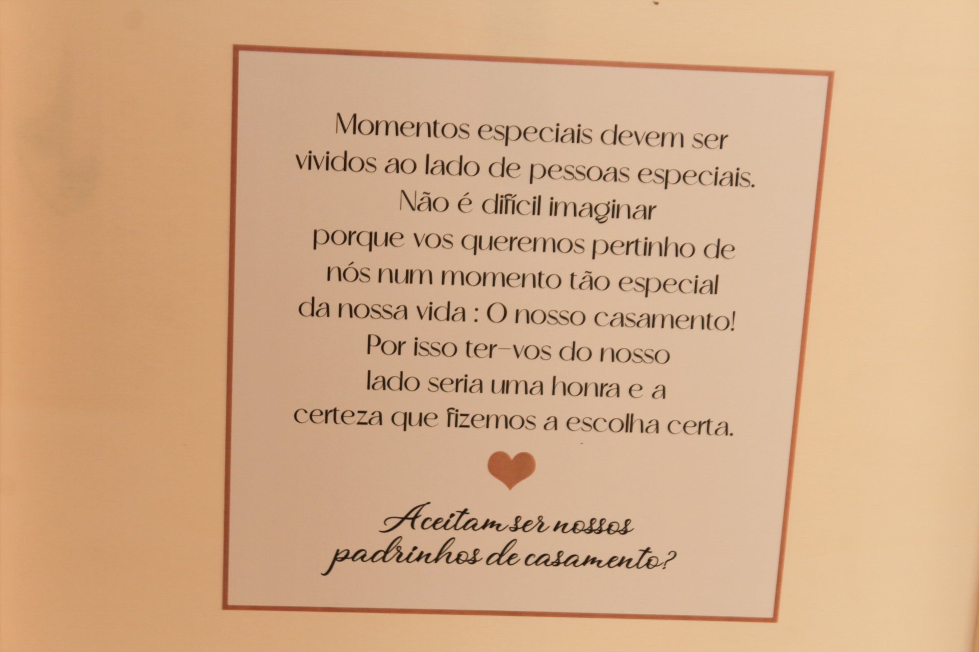 • Convite rosa com texto em português a pedir para serem padrinhos de casamento