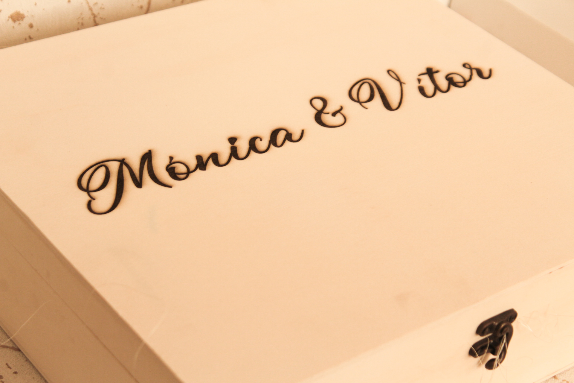 • Caixa branca com texto Mónica & Vítor em relevo preto