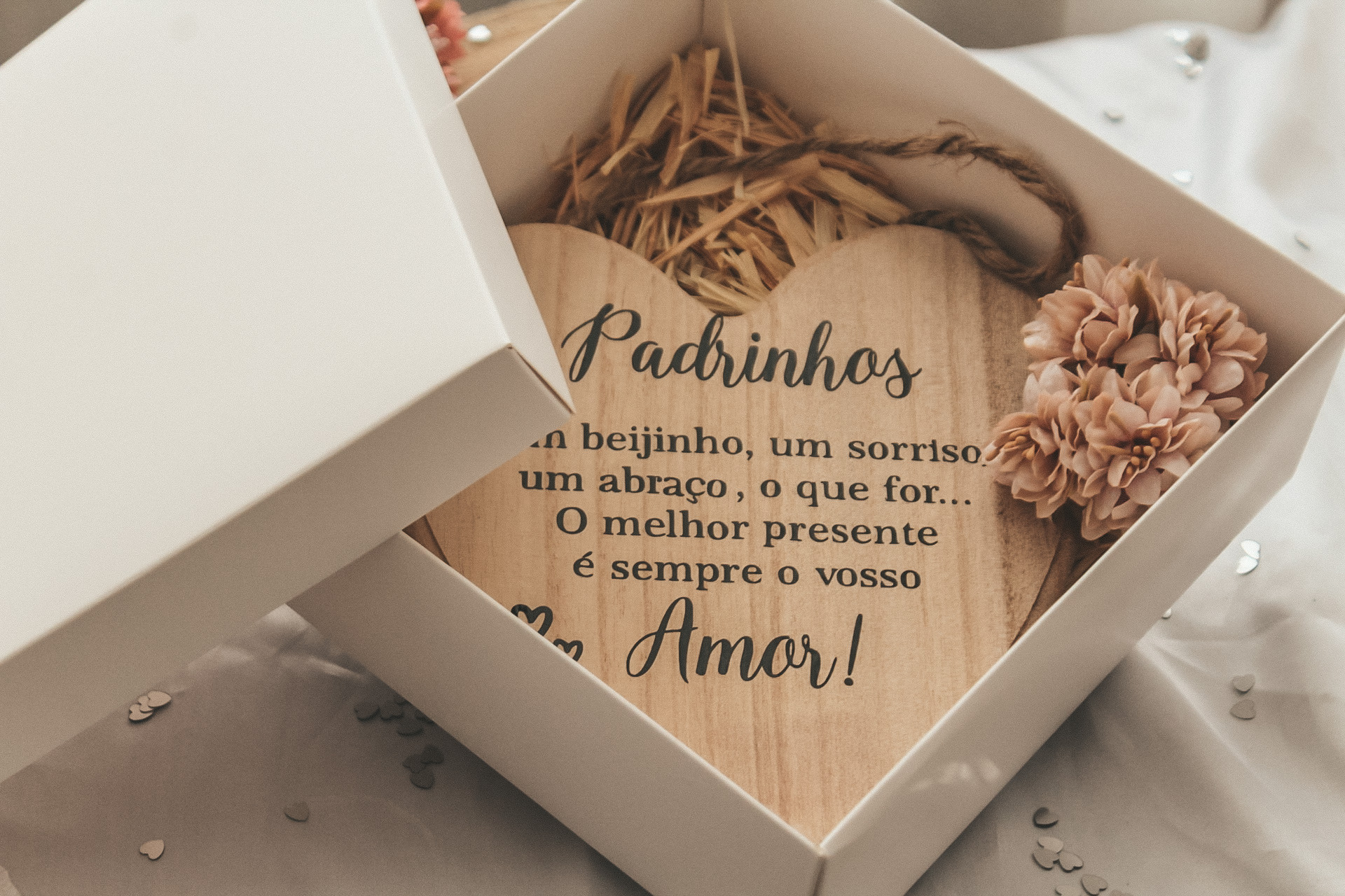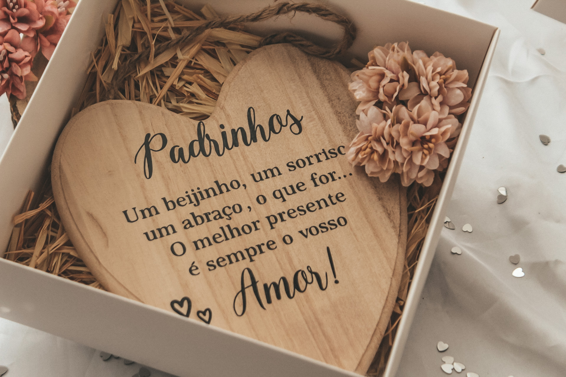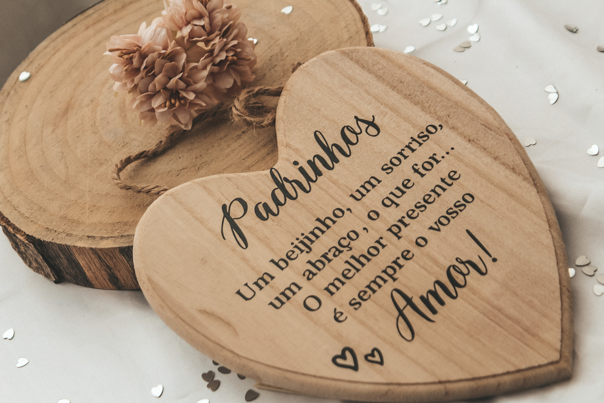 • Placa de madeira em forma de coração com texto em caixa branca aberta junto a flores secas cor de rosa