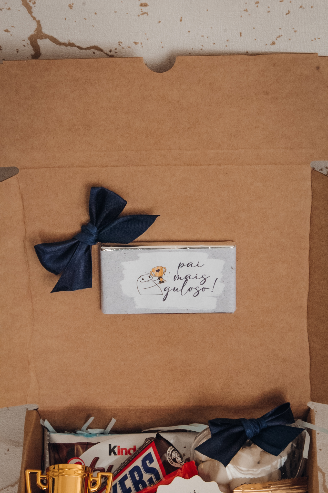 • Caixa de presente com chocolates Kinder, troféu dourado, placa branca com mensagem e cartão com mensagem numa embalagem castanha com laço azul.