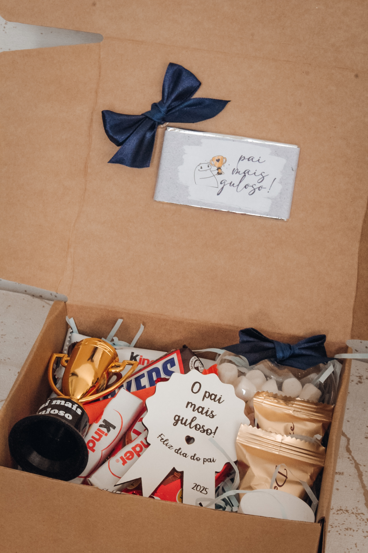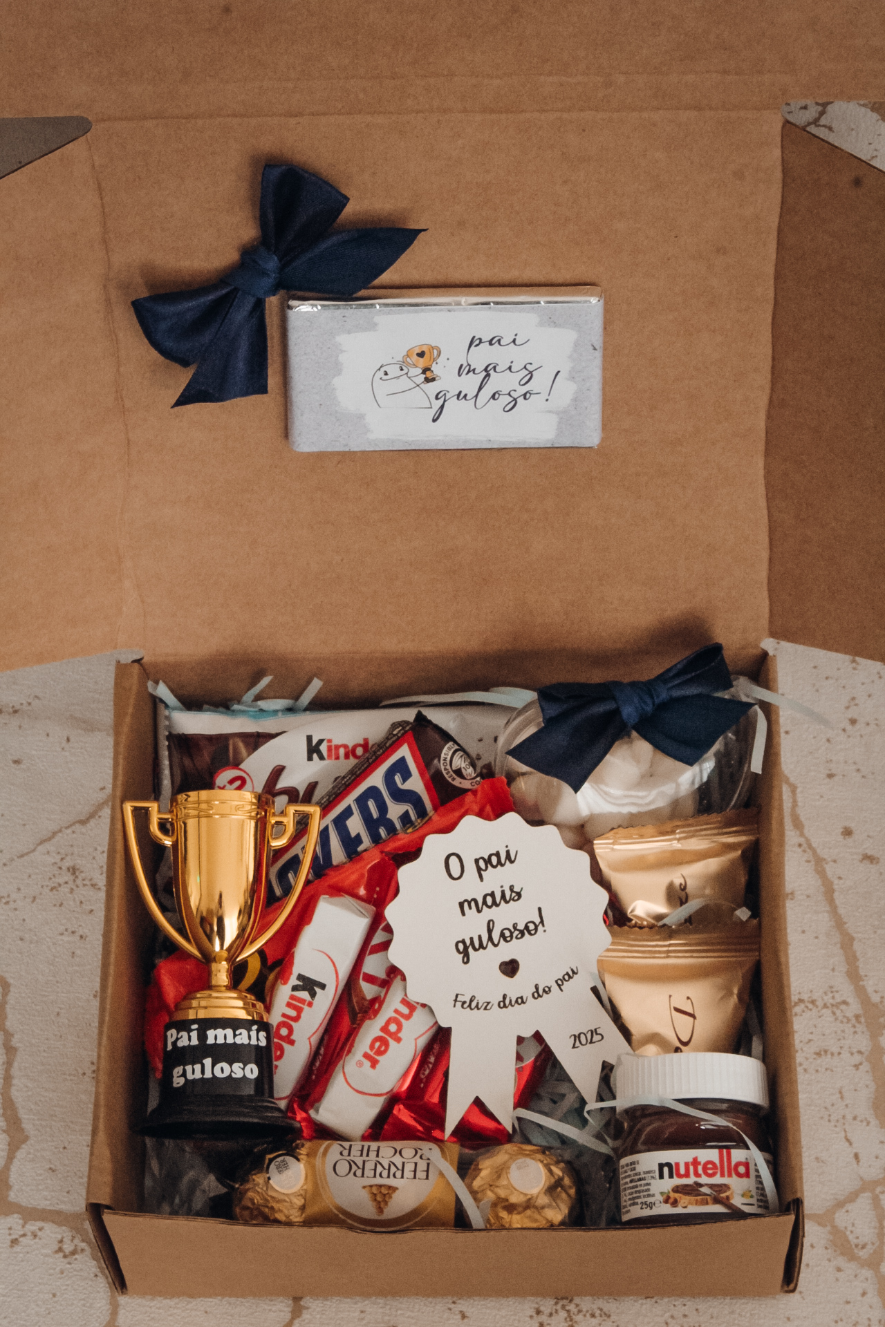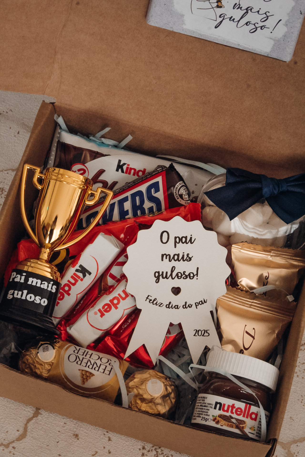 • Caixa com chocolates Kinder, Snickers, Ferrero Rocher, Nutella, troféu e cartão comemorativo dia do pai