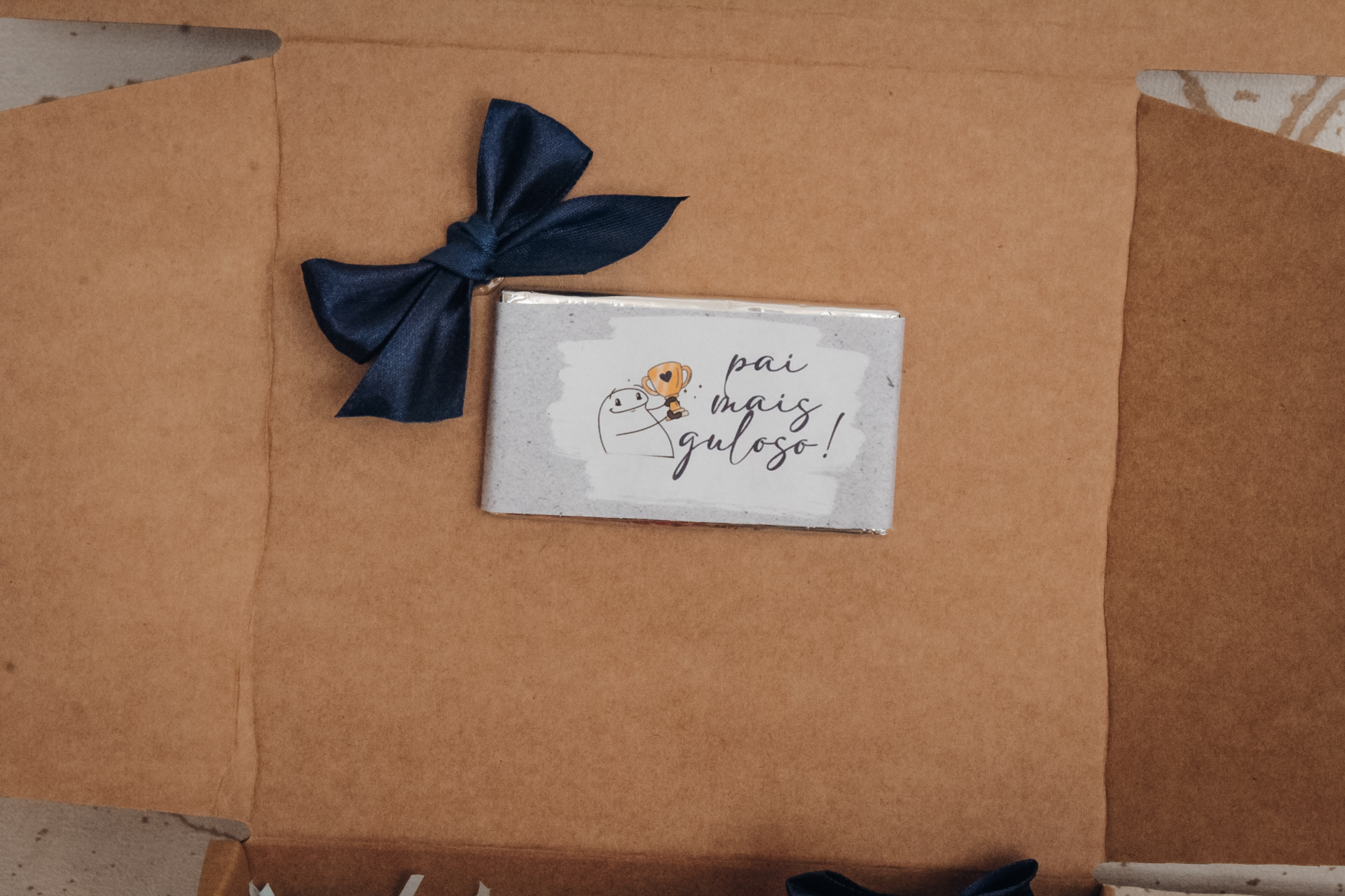 • Caixa de cartão castanha aberta com laço azul e barra de chocolate com texto em papel branco
