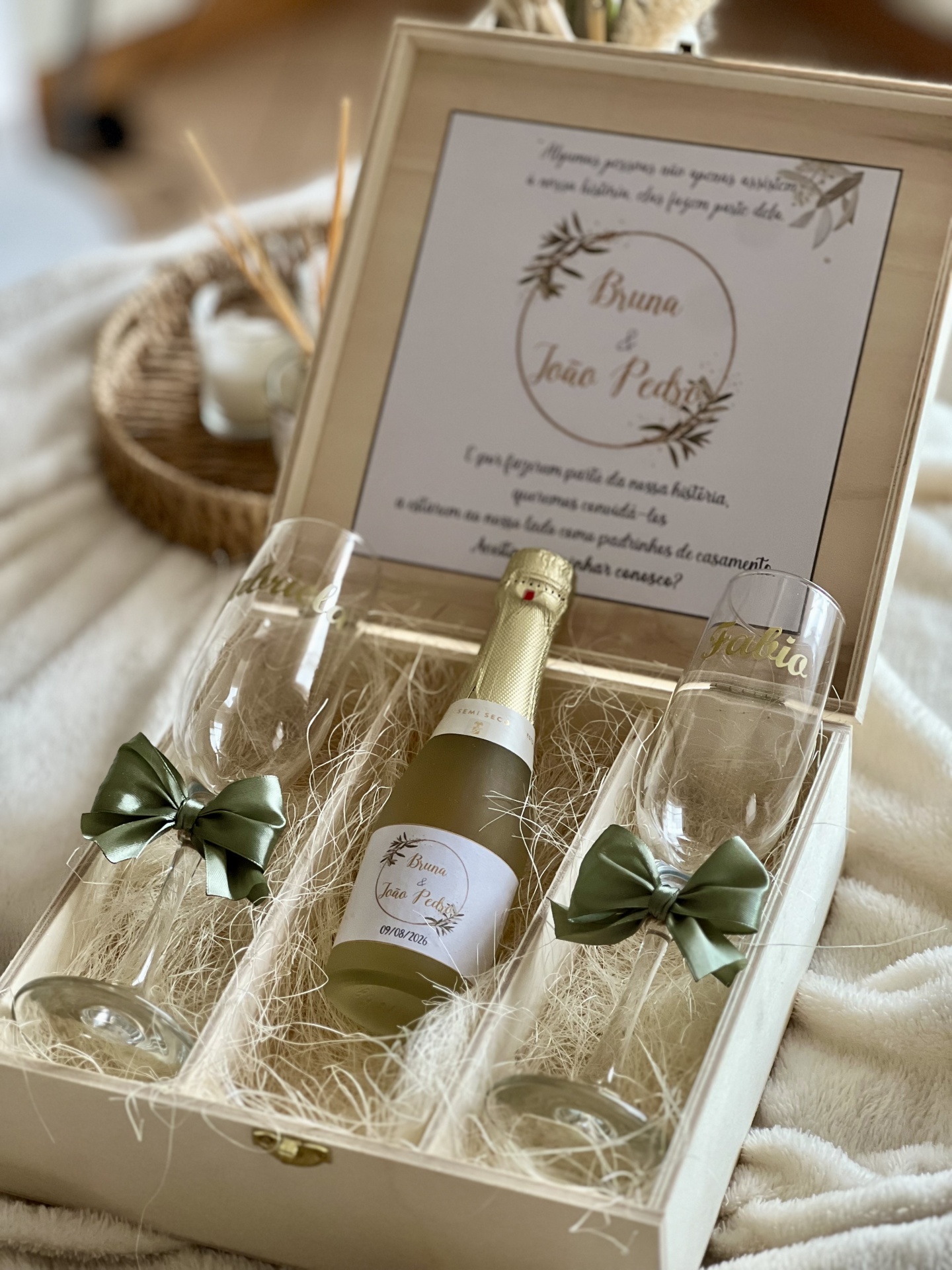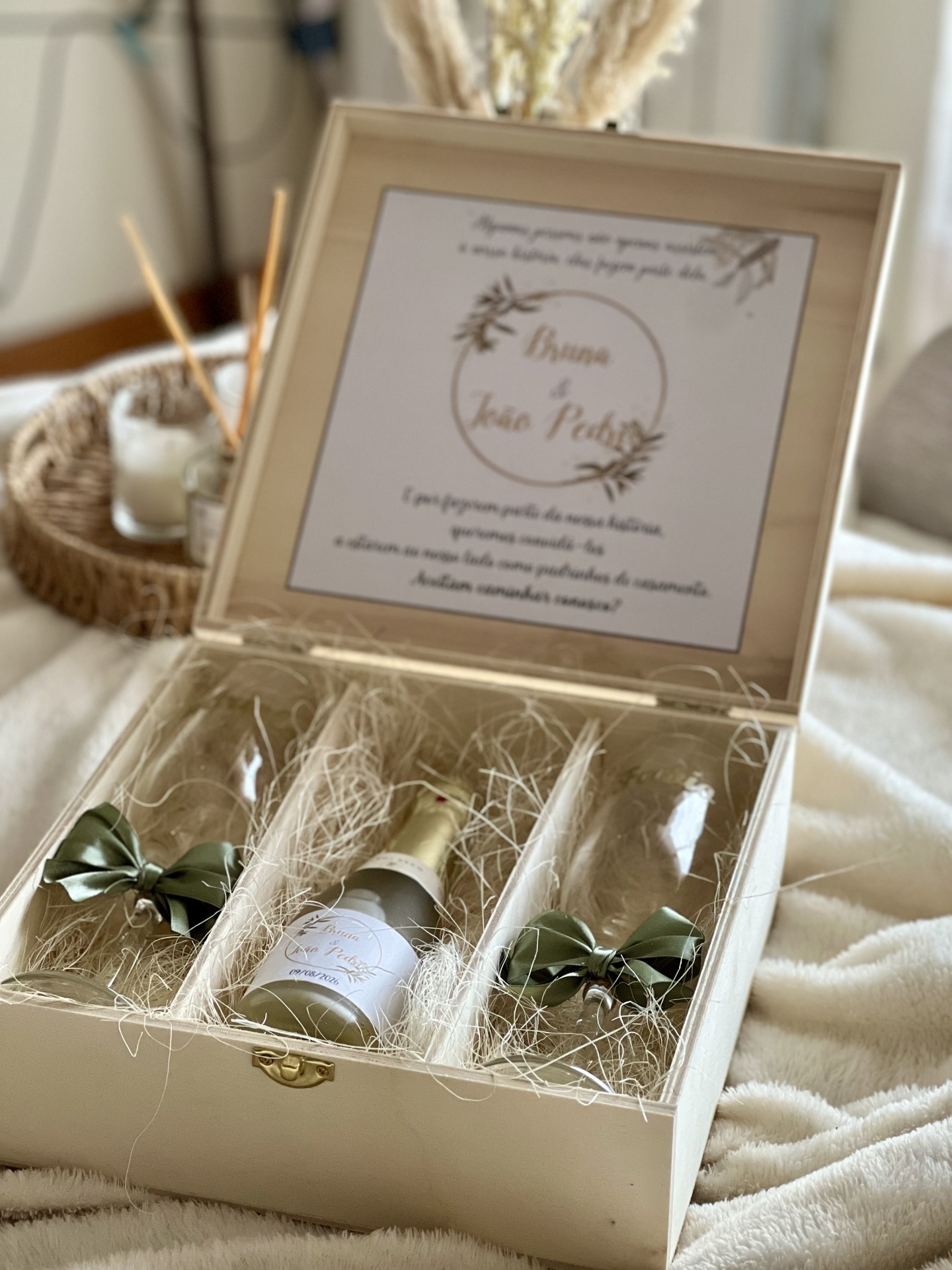 • Conjunto de presente de champanhe personalizado com copos e mensagem dentro de caixa de madeira