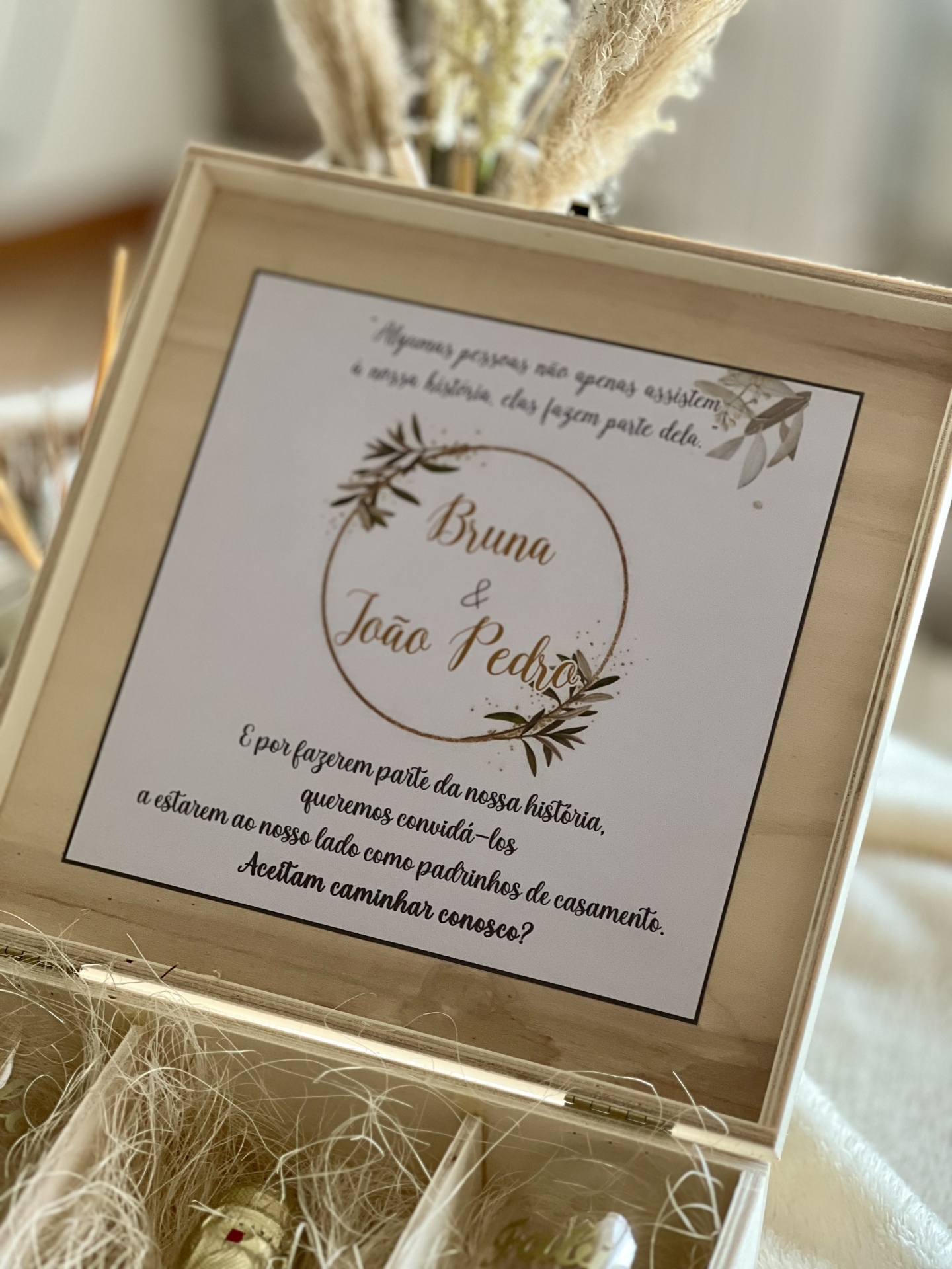 • Convite de casamento em caixa de madeira com texto e detalhes florais