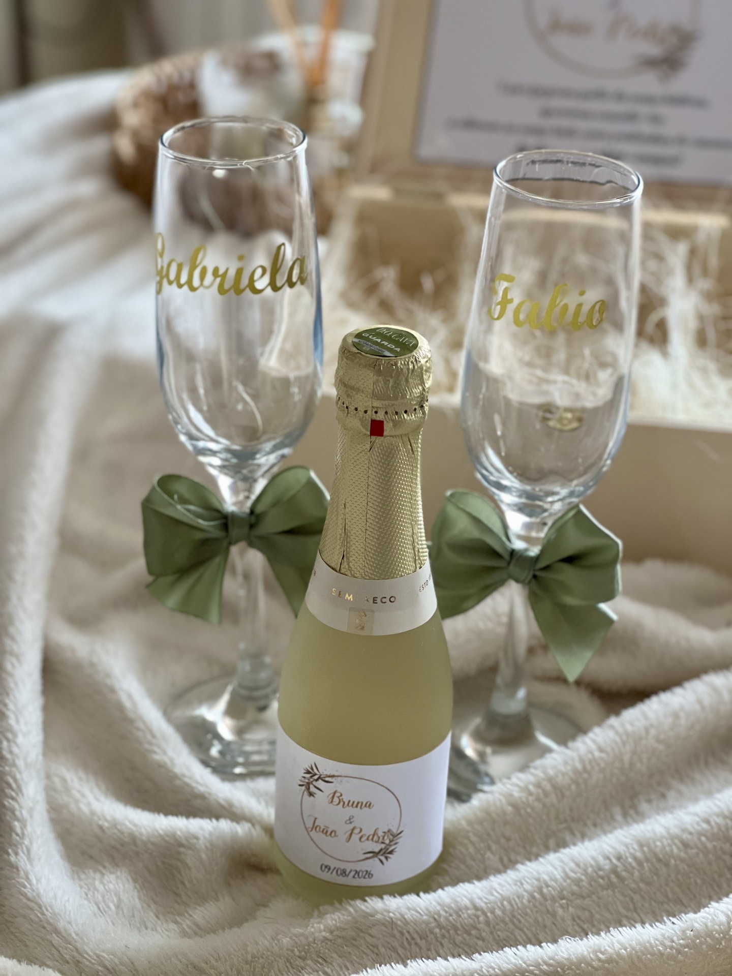 • Conjunto de flautas de vidro com nomes dourados, laços verdes e mini garrafa de espumante com rótulo personalizado sobre tecido creme.