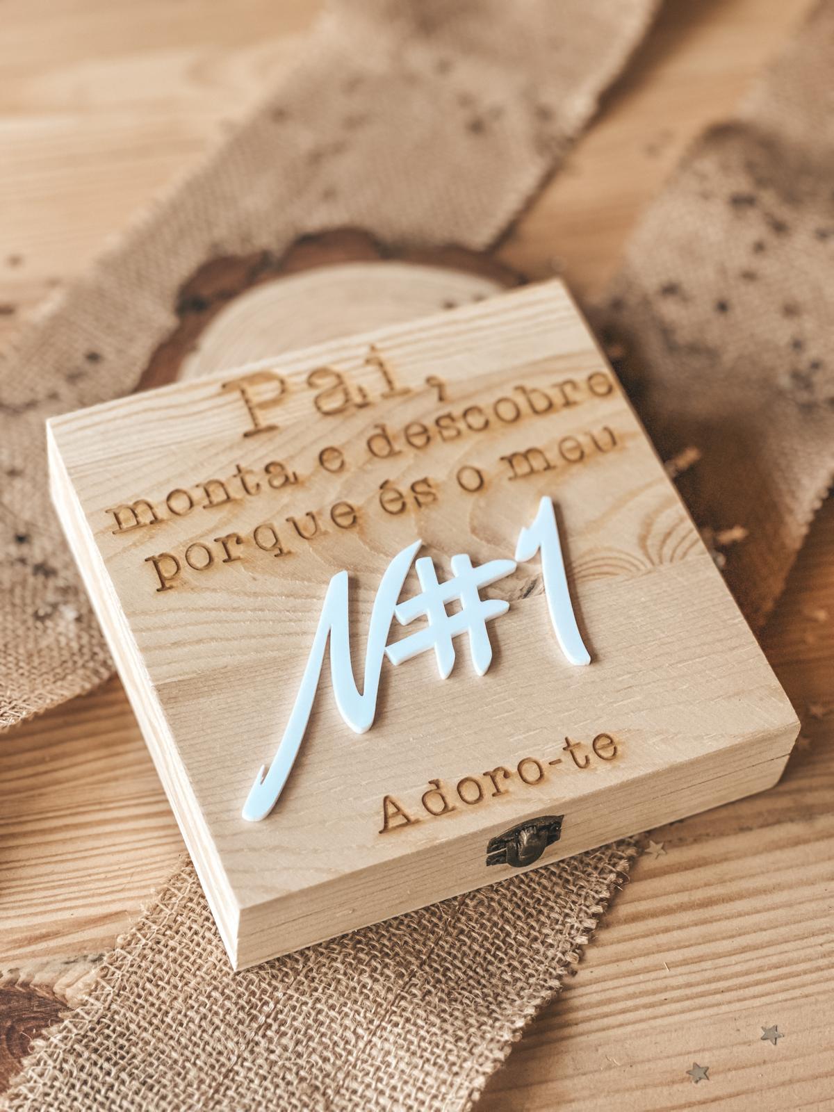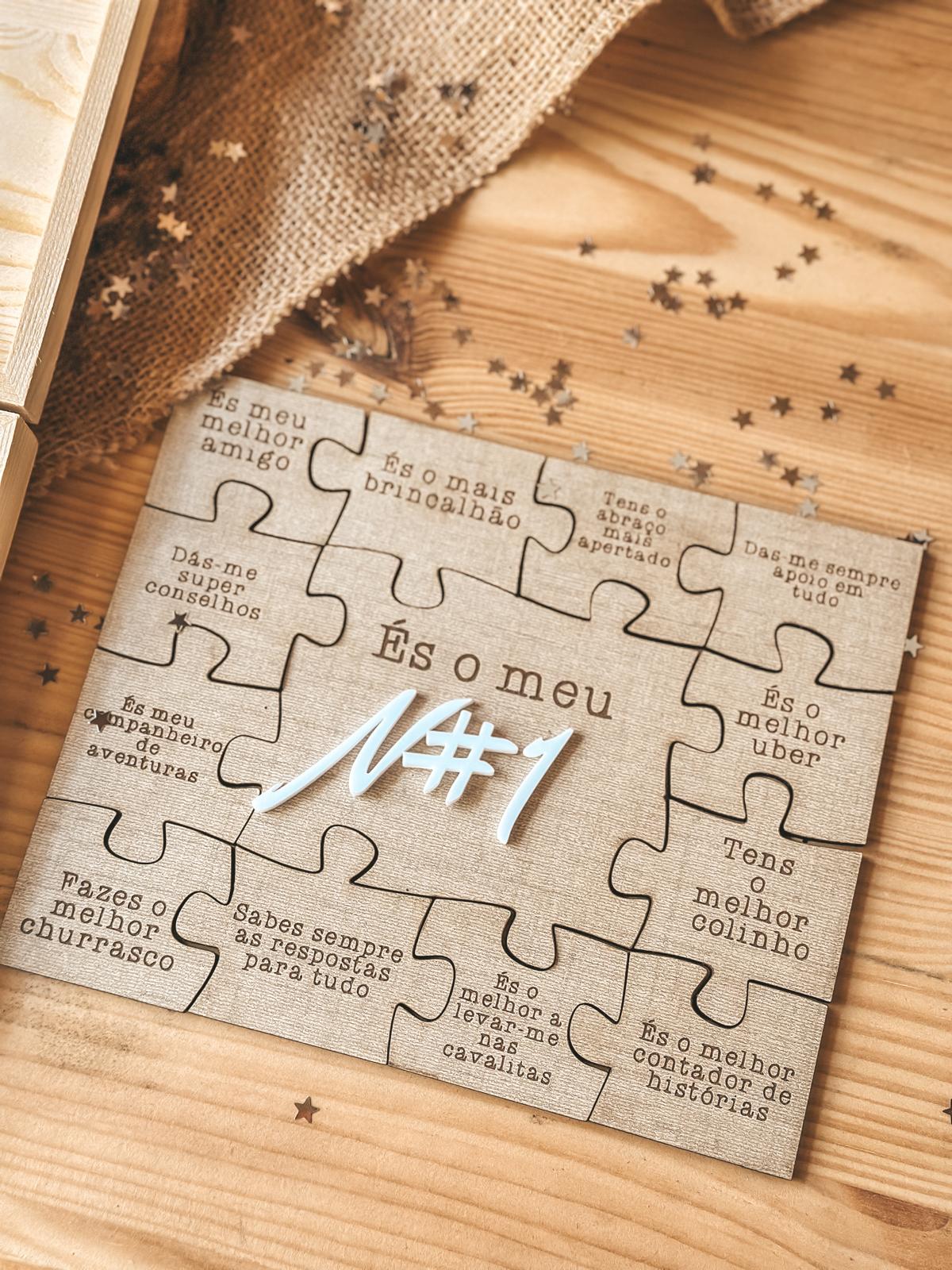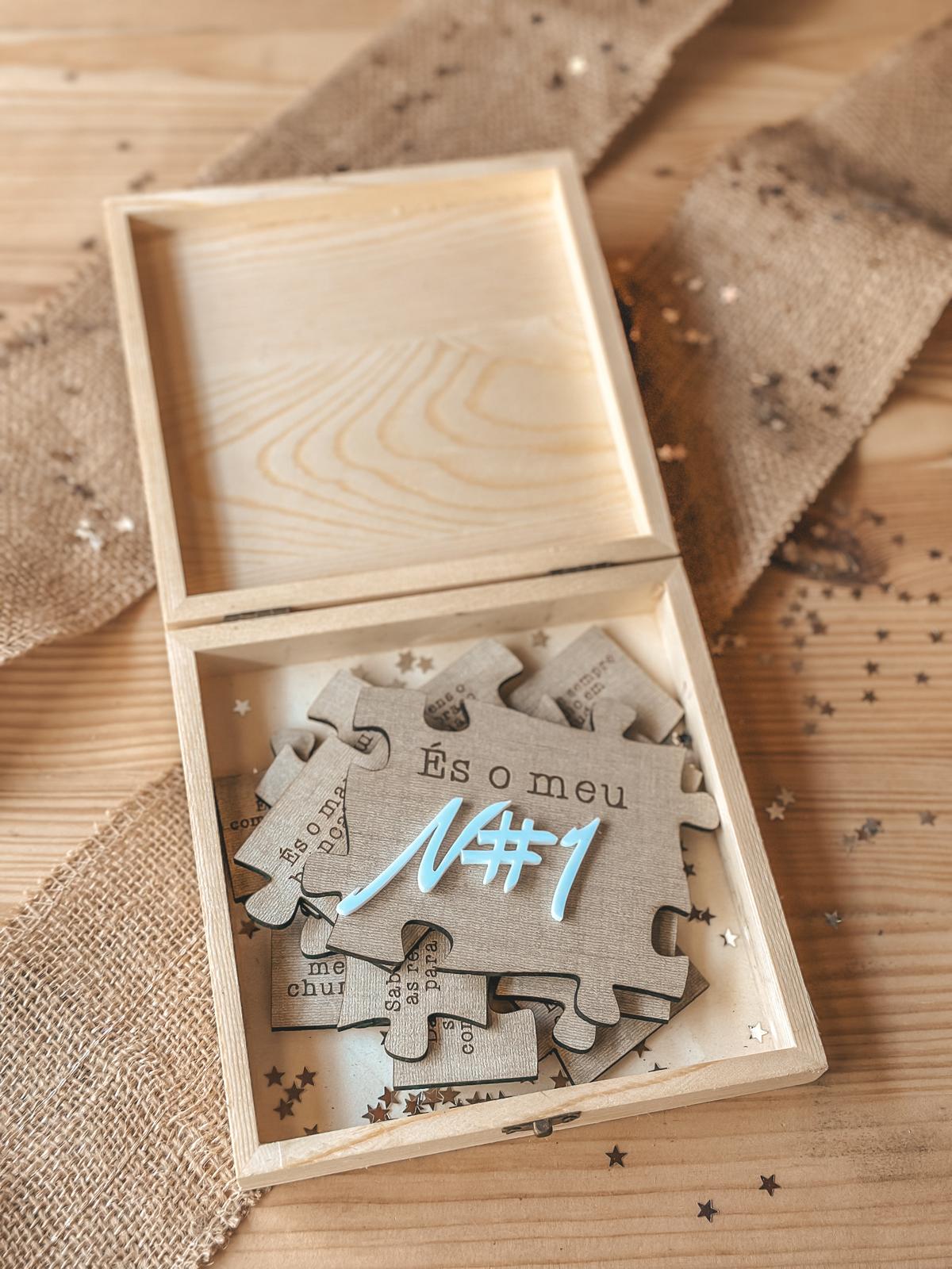 • Caixa de madeira aberta com peças de puzzle de madeira e texto És o meu Nº#1
