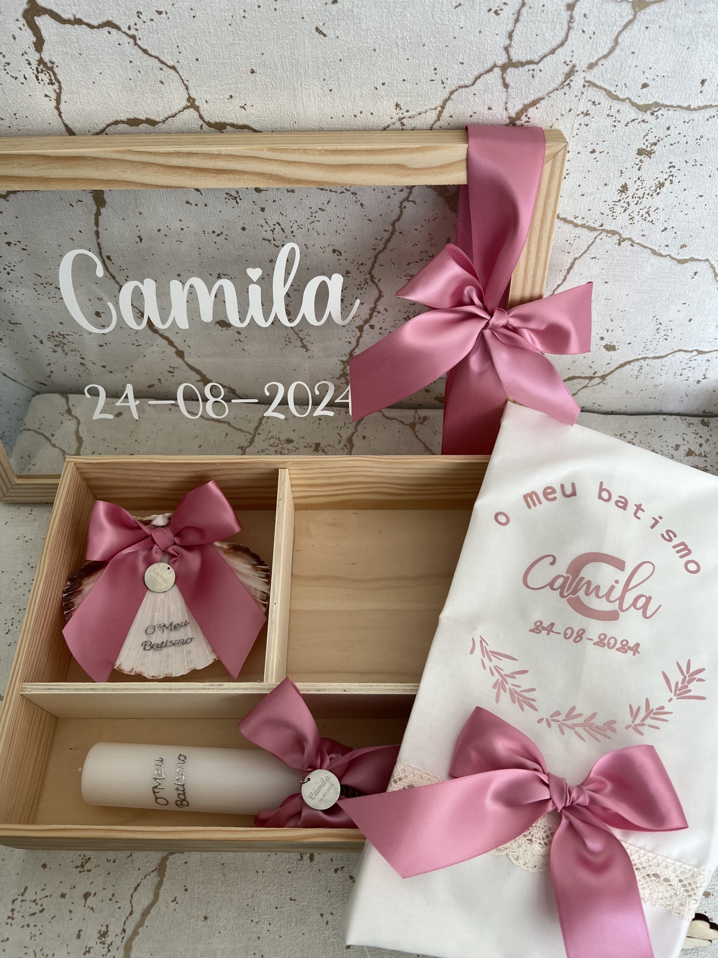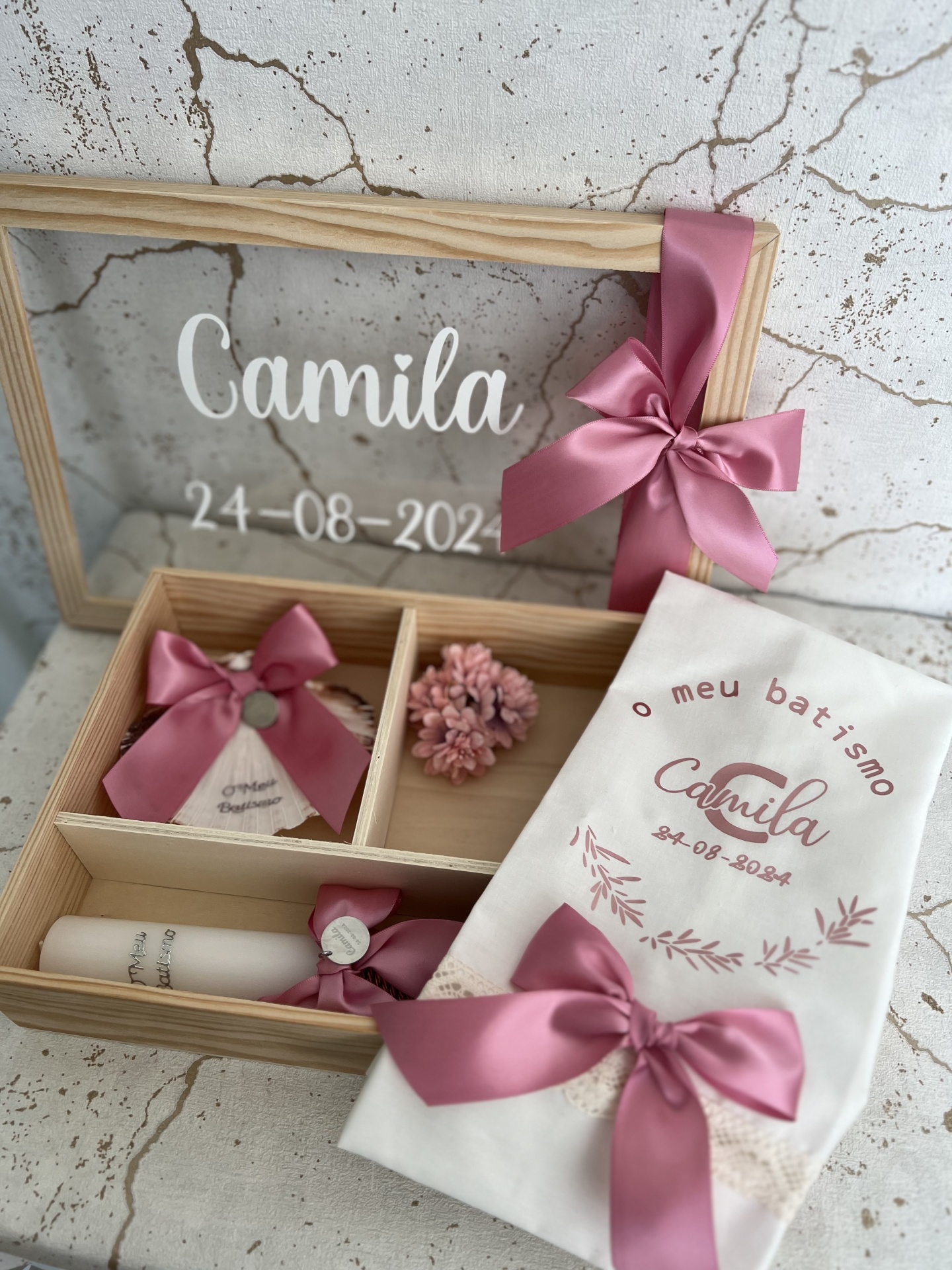 • Conjunto de batismo com caixa de madeira, toalha branca e quadro de vidro com fitas rosas