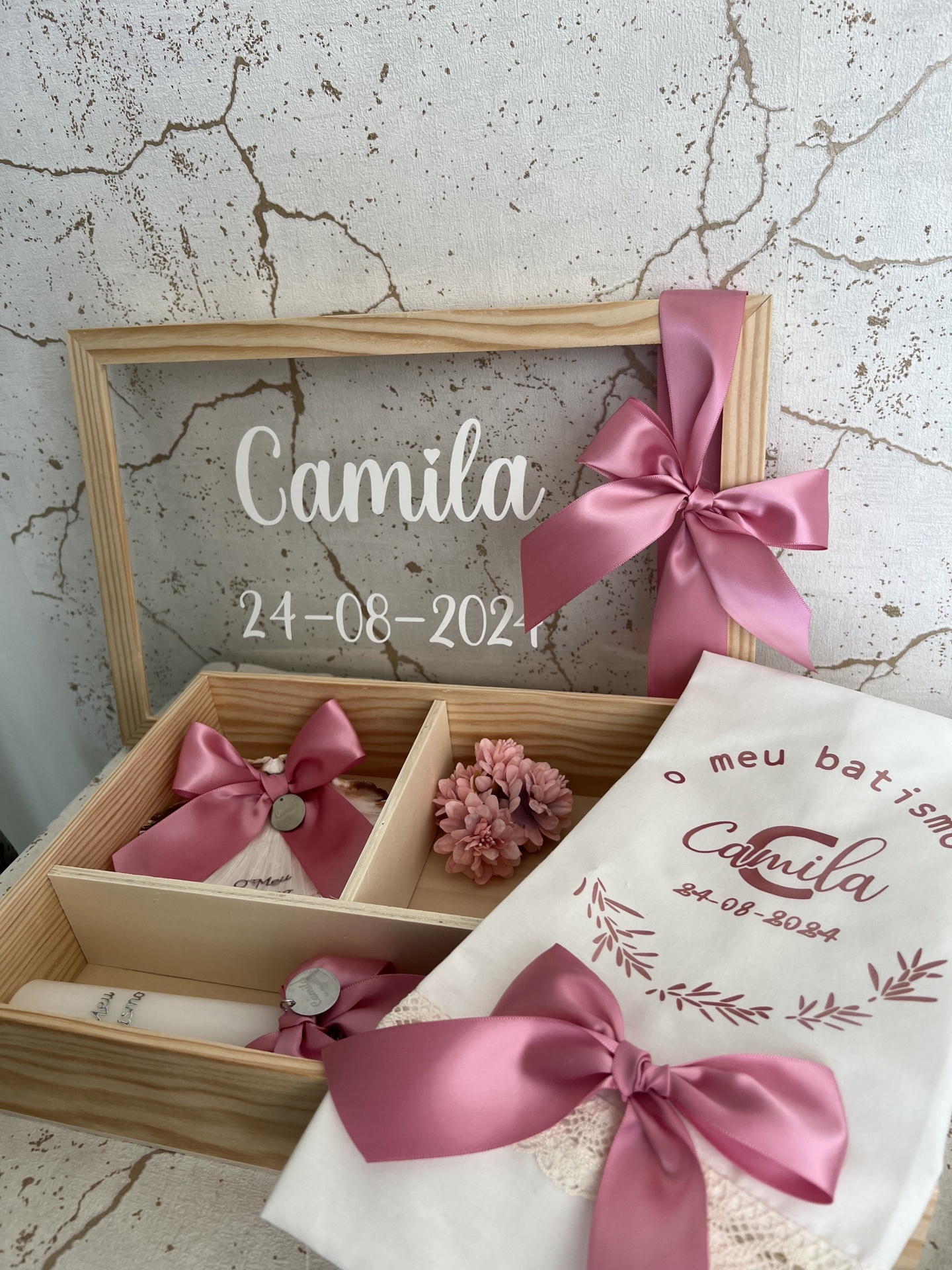 • Caixa de batismo de madeira com decoração rosa e toalha branca com texto em rosa