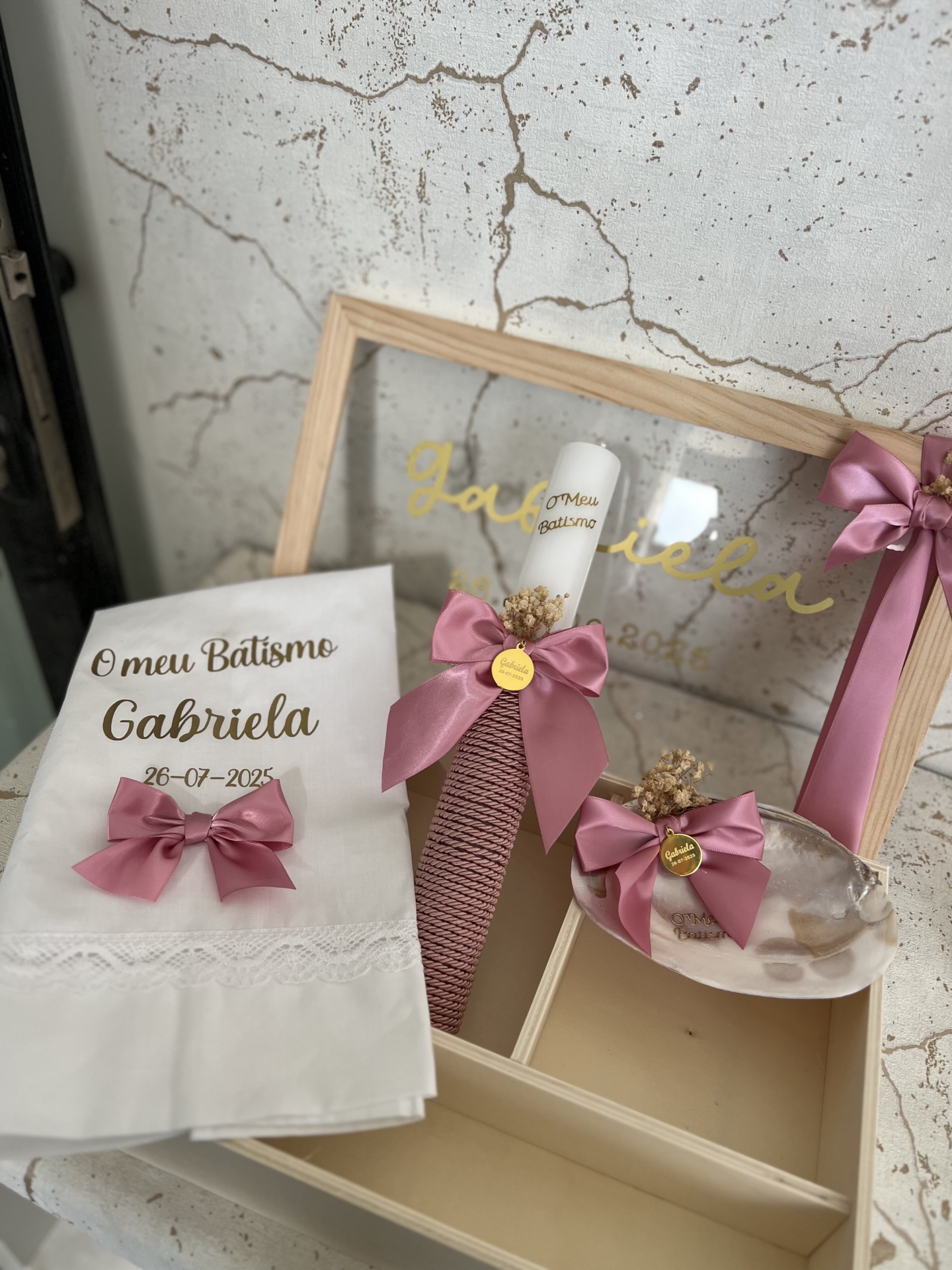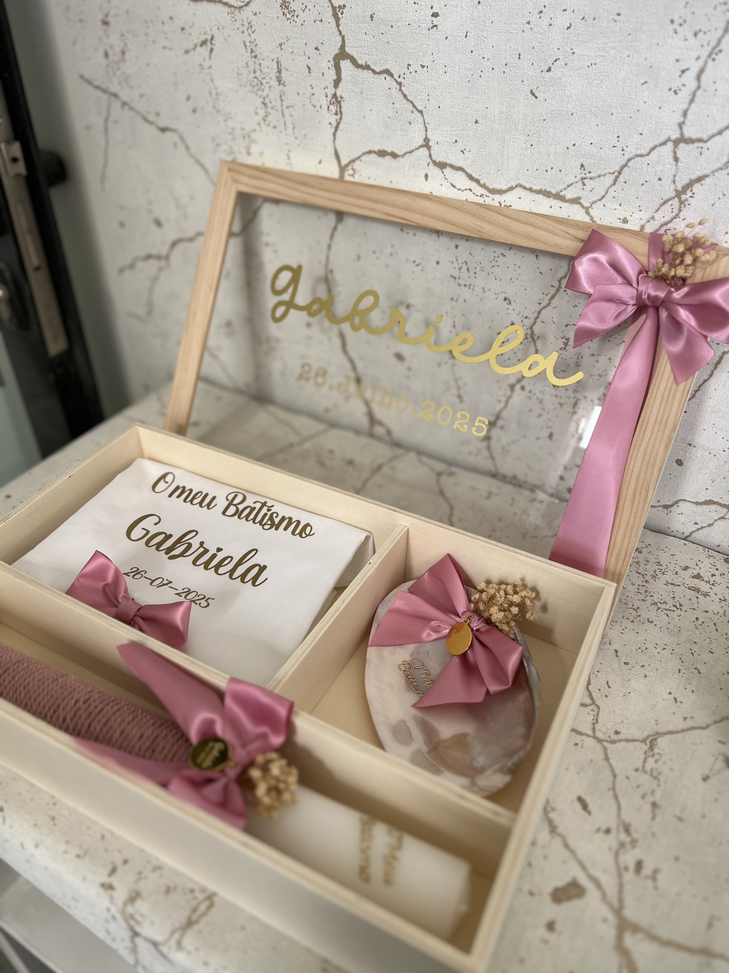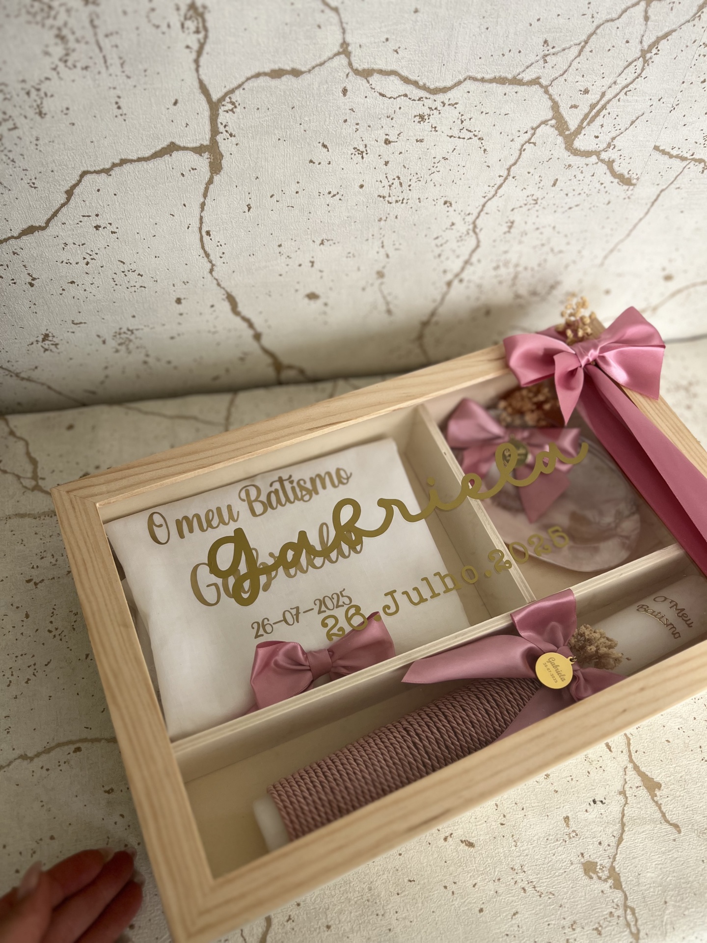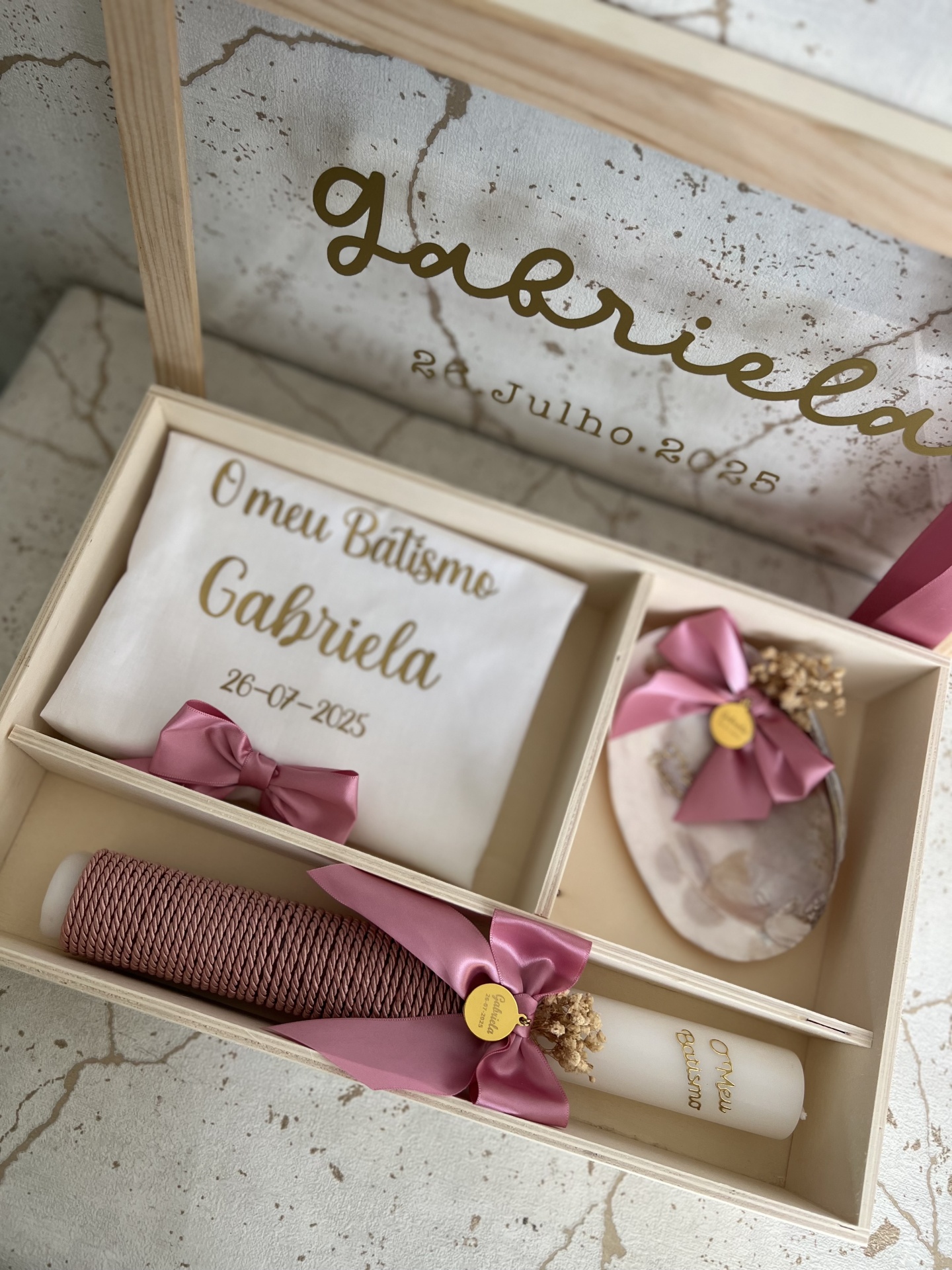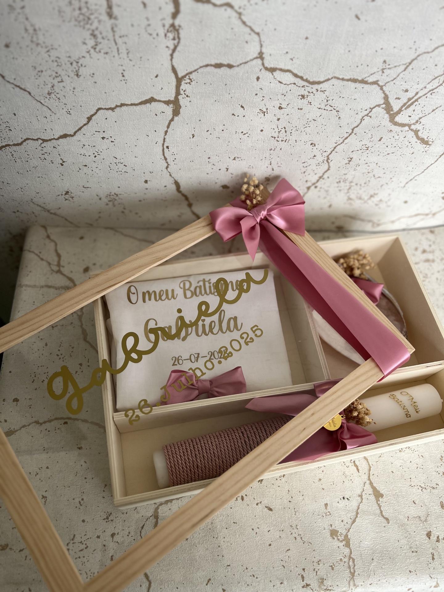 • Caixa de madeira com toalha, vela e flores para batismo com texto dourado