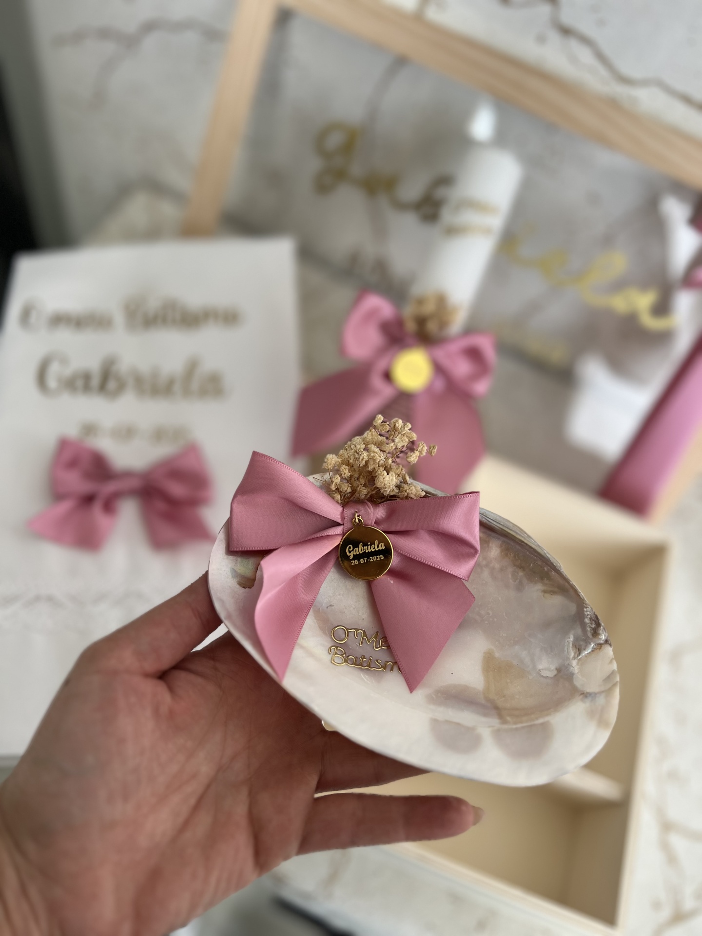 • Conjunto de cerimónia com prato de resina, vela decorada, convite e caixa com laços rosa e flores secas