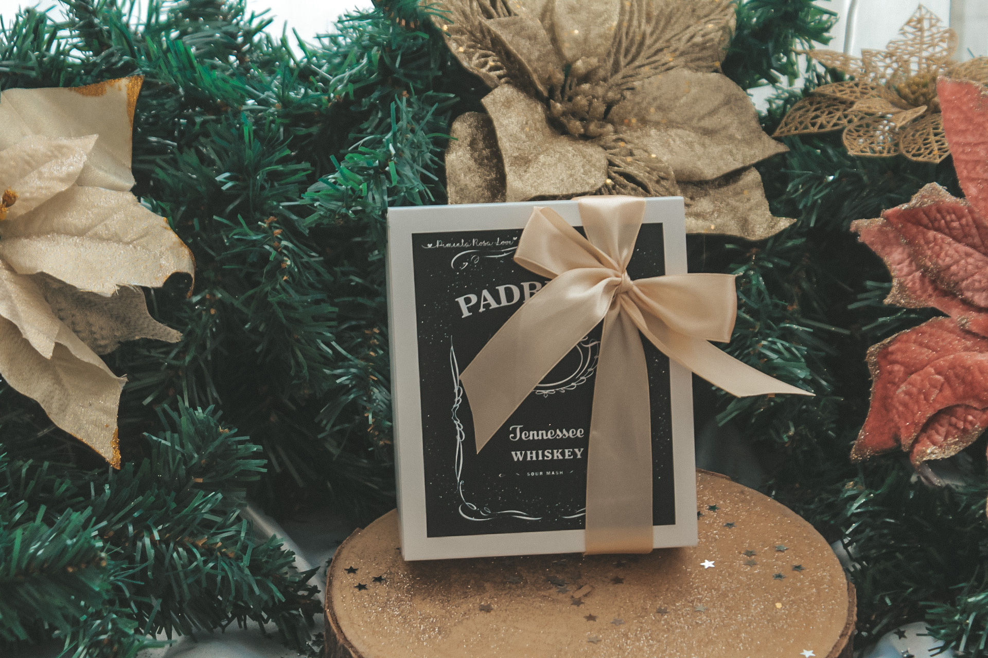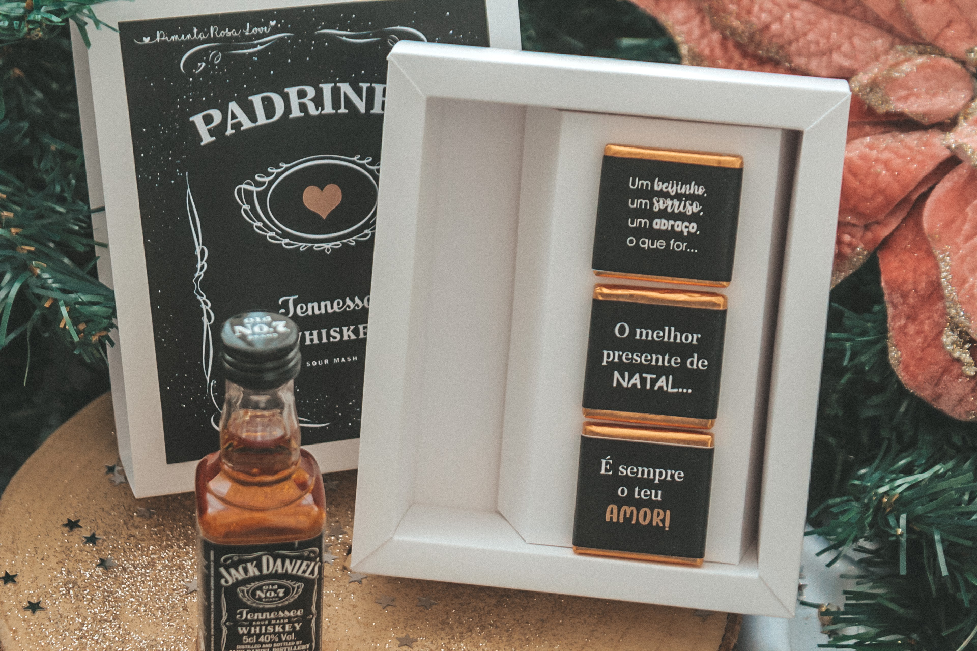• Caixa de presente com chocolates e etiqueta preta com texto Padrinho Tennesse Whisky