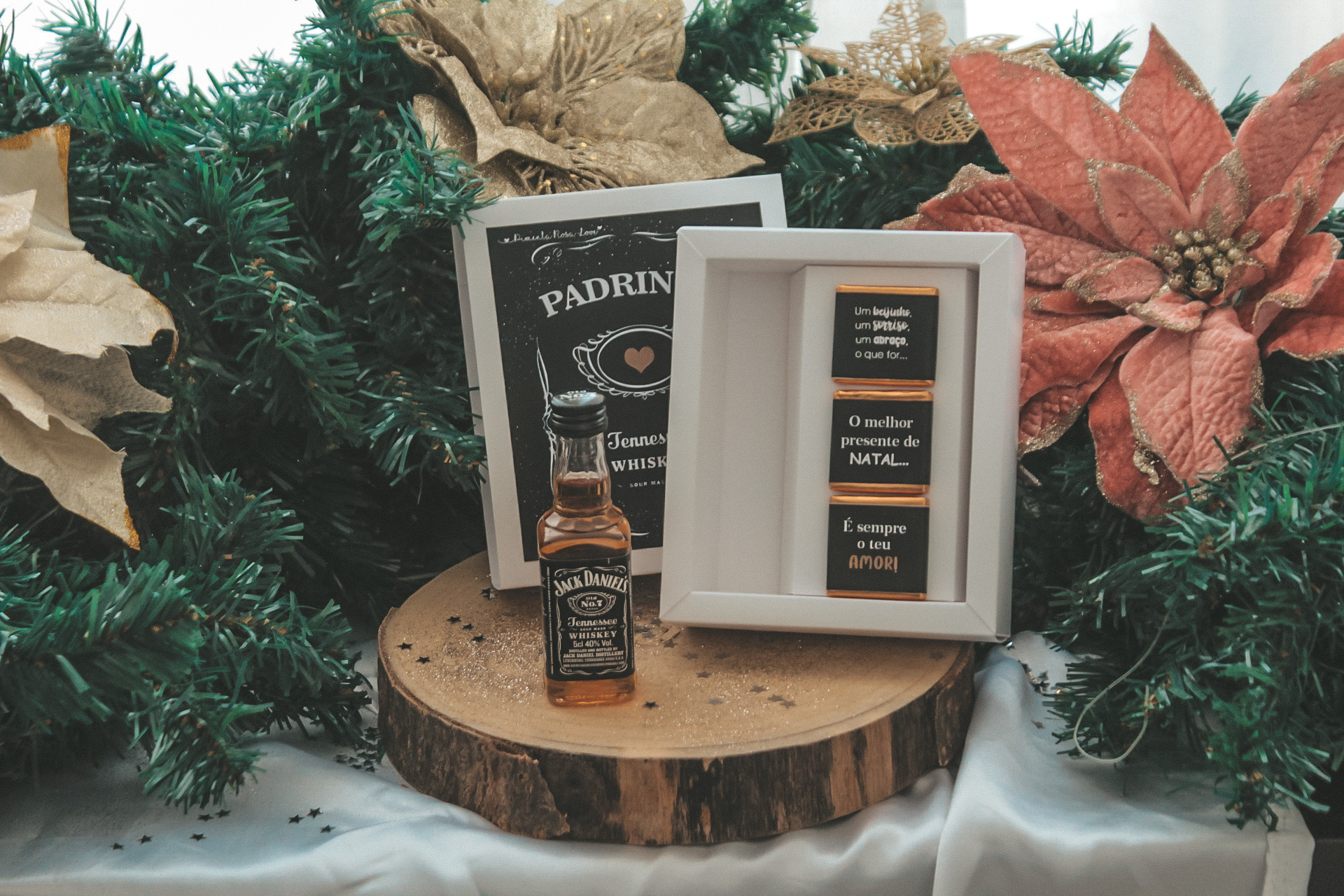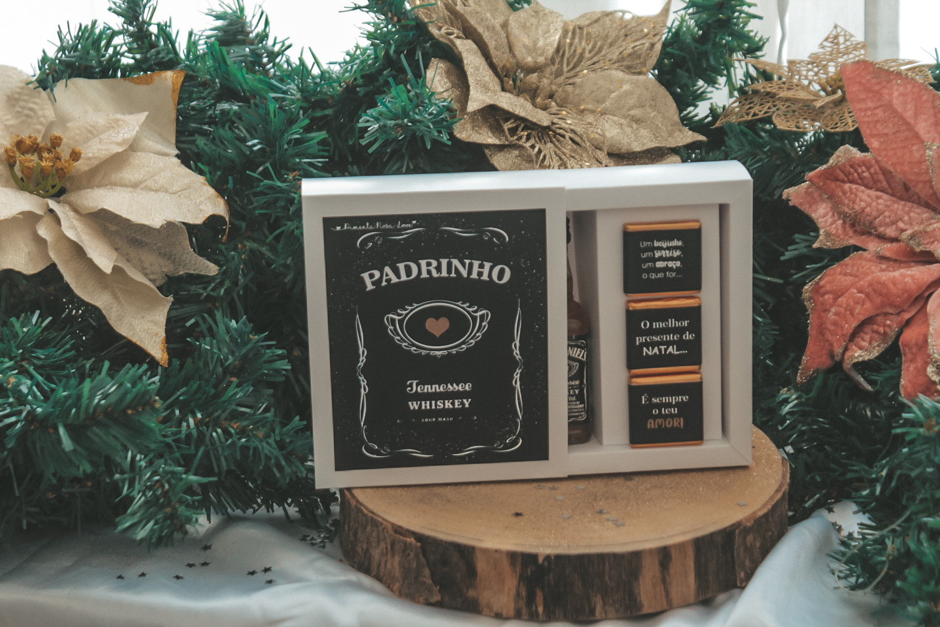 • Presente de Natal com mini garrafa de uísque, chocolate com mensagem e decoração natalícia