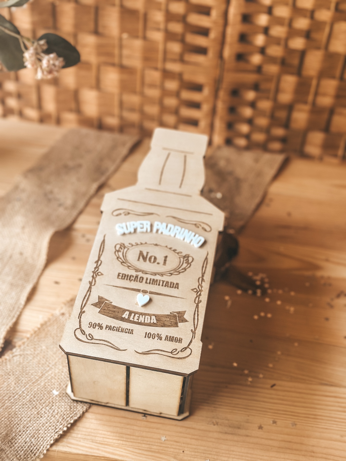 • Caixa de madeira em forma de garrafa com texto gravado para padrinho