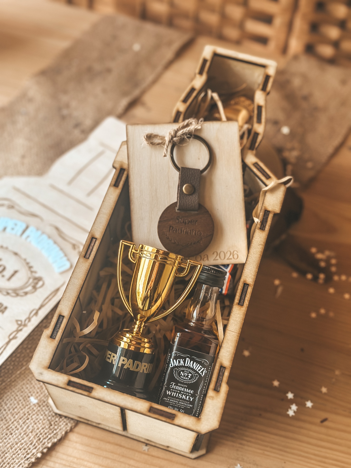 • Conjunto presente com garrafa de whiskey, troféu dourado, porta-chaves de madeira e couro numa caixa de madeira clara