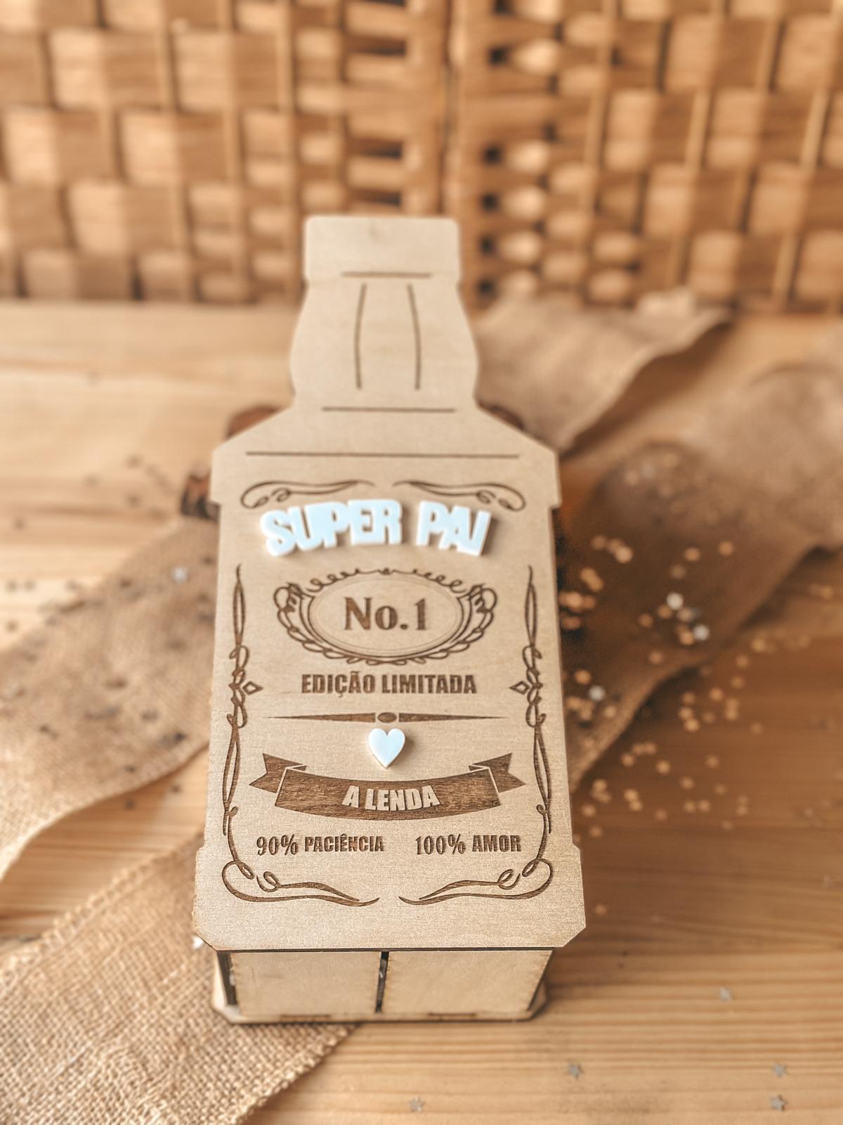 • Caixa de madeira em forma de garrafa com inscrições para o Dia do Pai