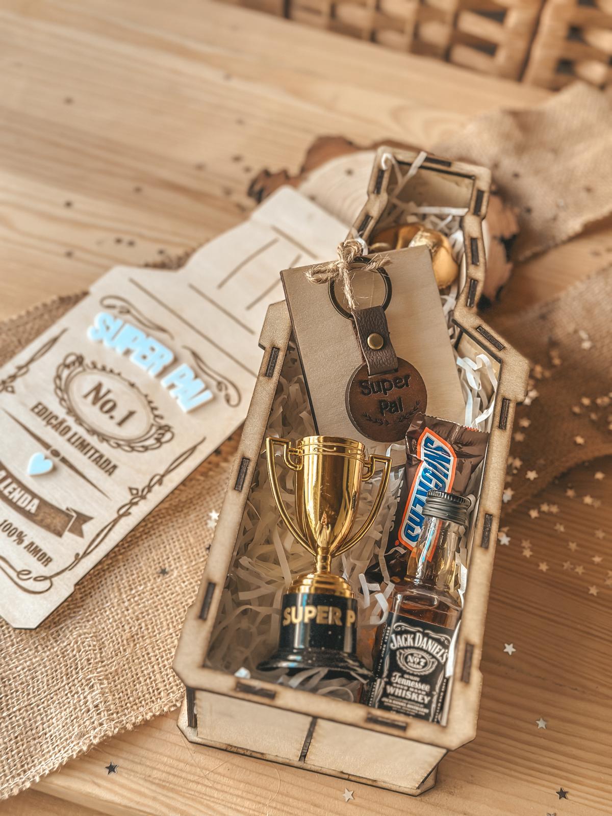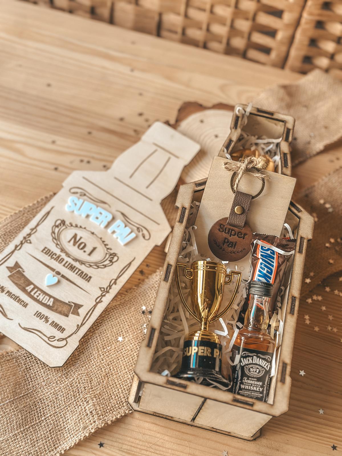 • Conjunto presente numa caixa de madeira com troféu, mini whiskey Jack Daniels, chocolate Snickers e porta-chaves Super Pai