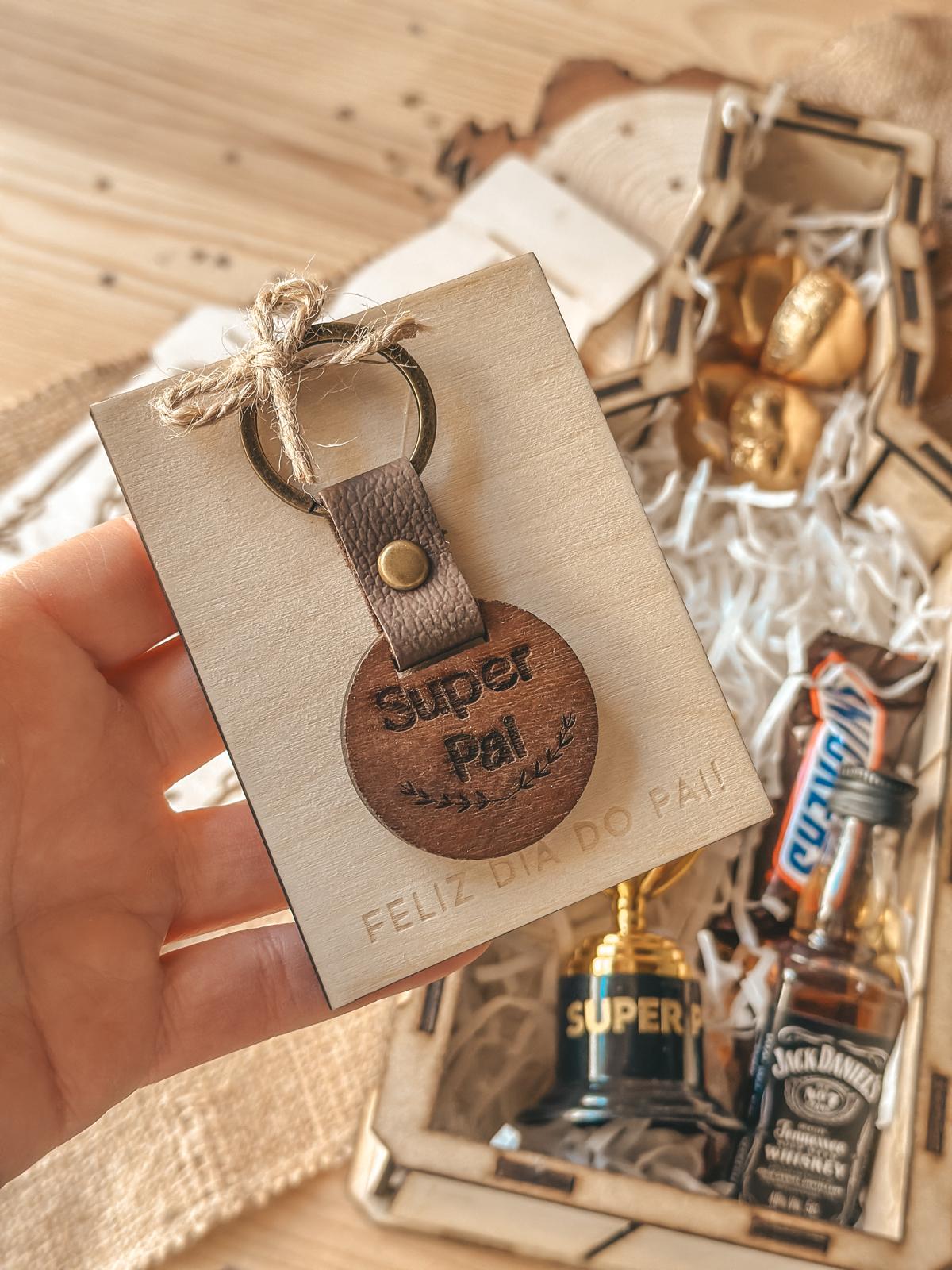 • Chaveiro de madeira e pele com gravação e cartão de felicitação para o Dia do Pai, com caixa de presente ao fundo.