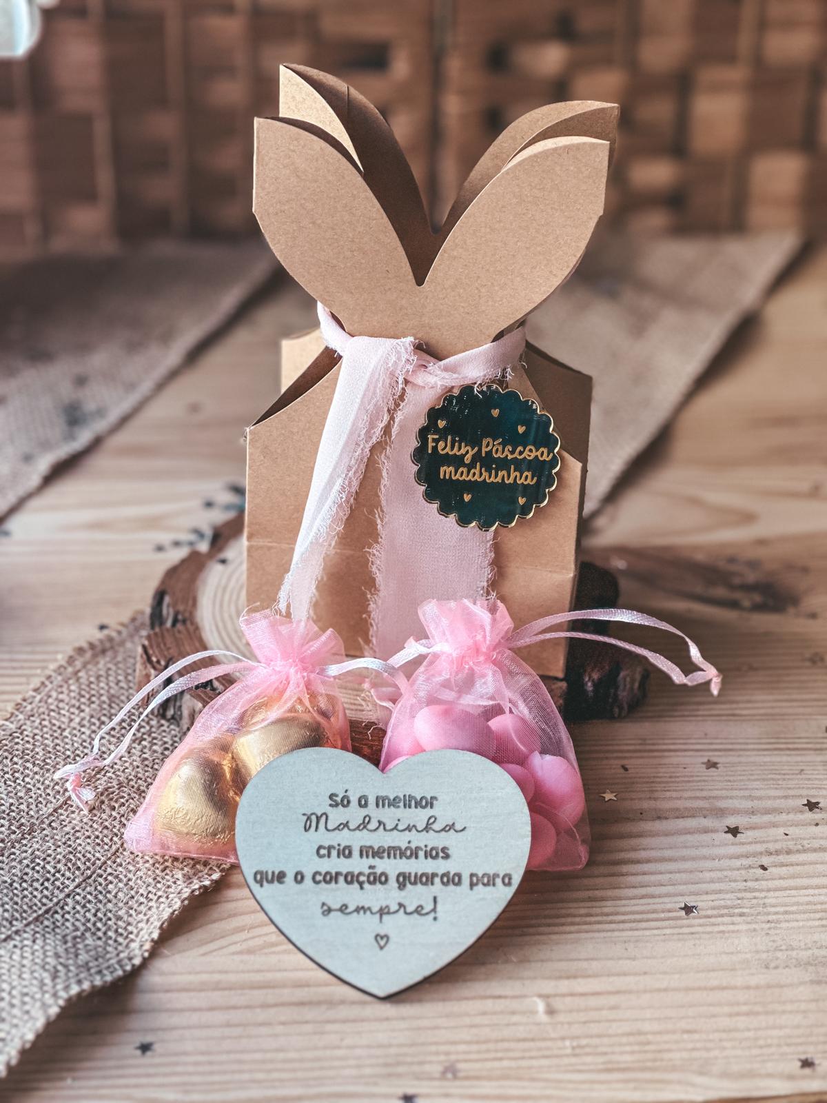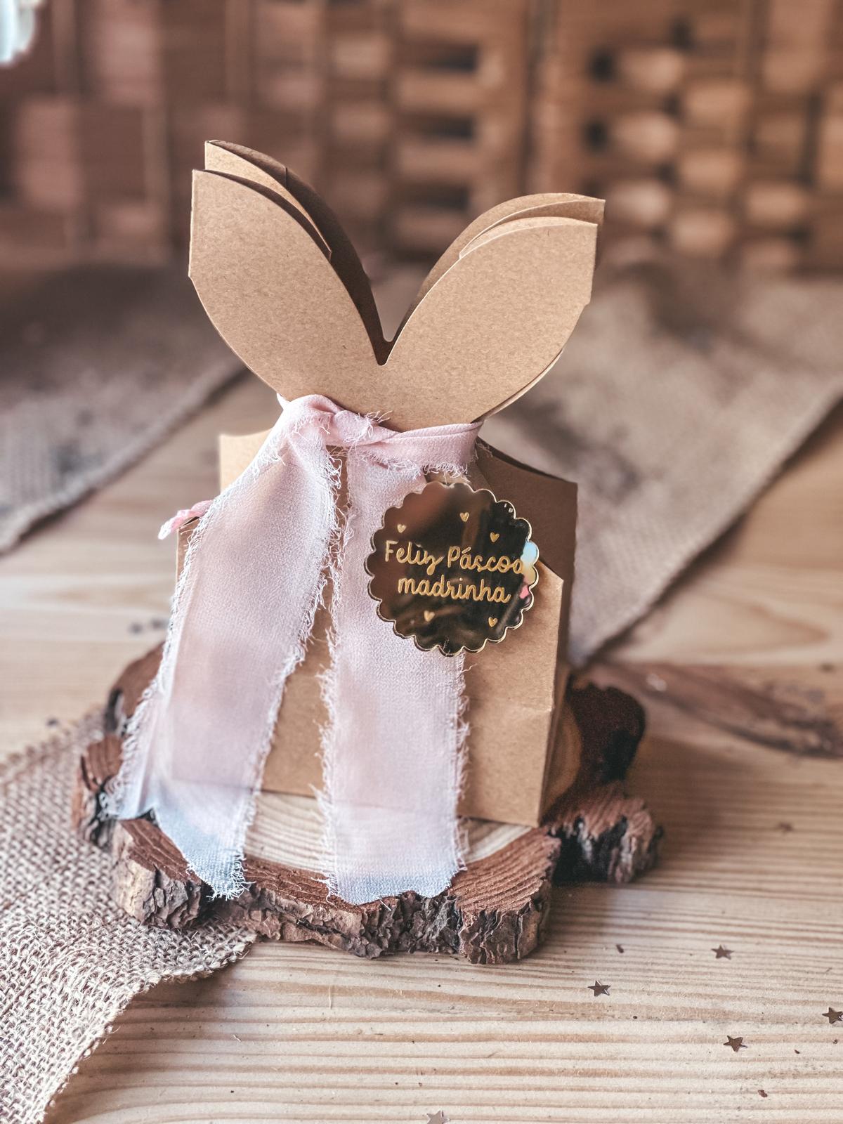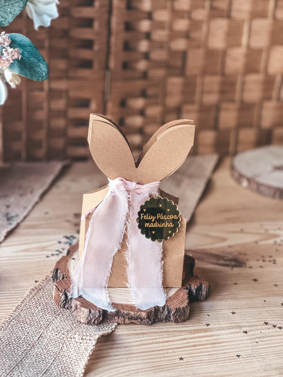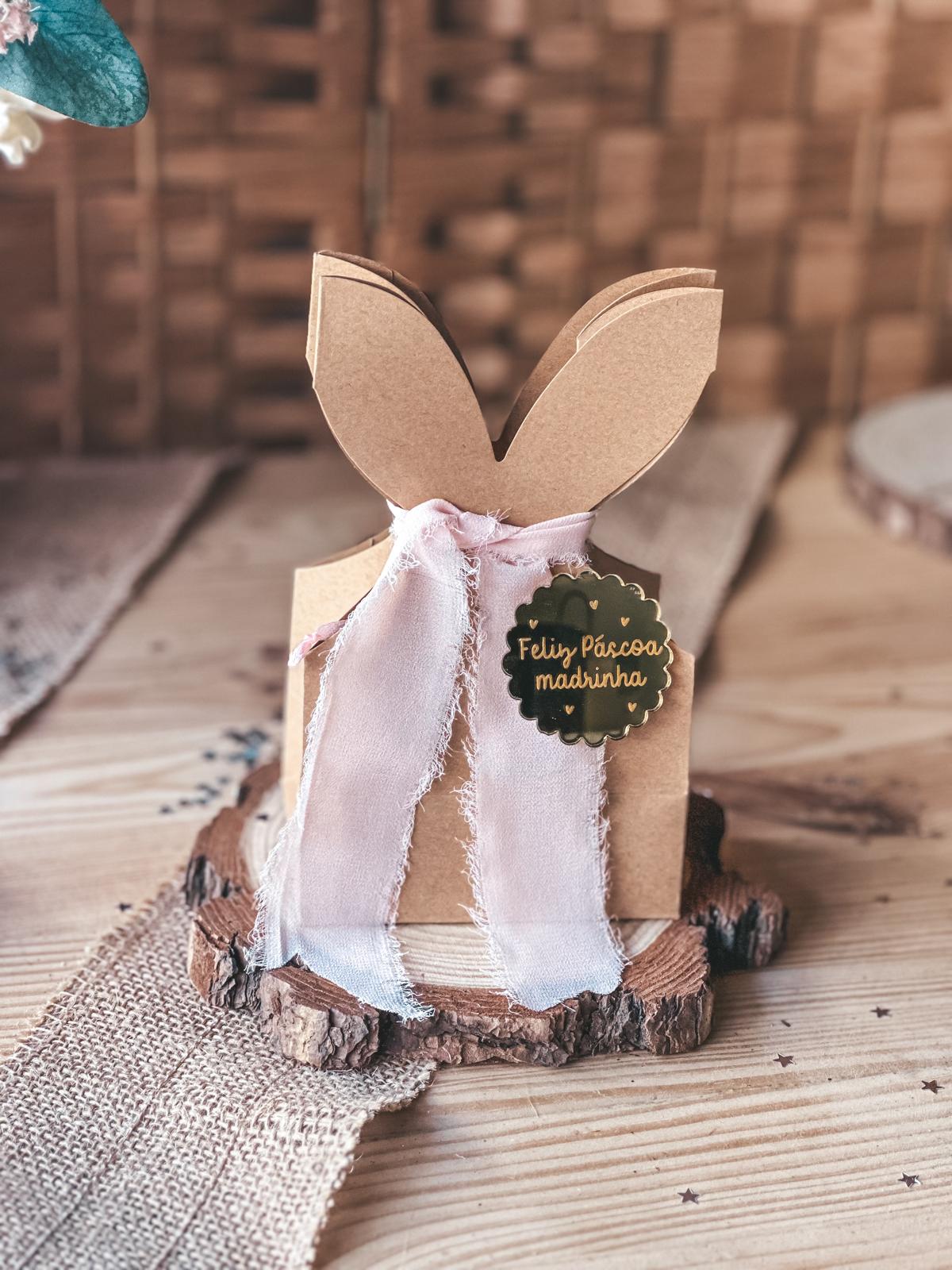 • Caixa de Páscoa em forma de coelho com fita rosa e etiqueta Feliz Páscoa madrinha numa base de madeira rústica.