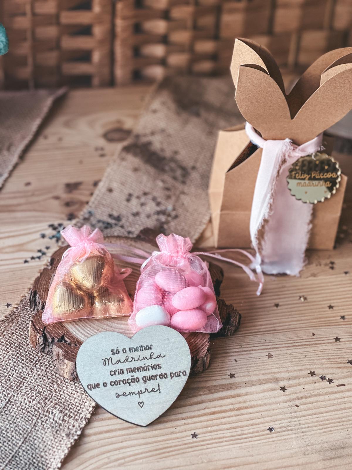• Saquinhos de organza com chocolates, placa de madeira em forma de coração com texto e embalagem de papel castanho com orelhas de coelho numa mesa de madeira.
