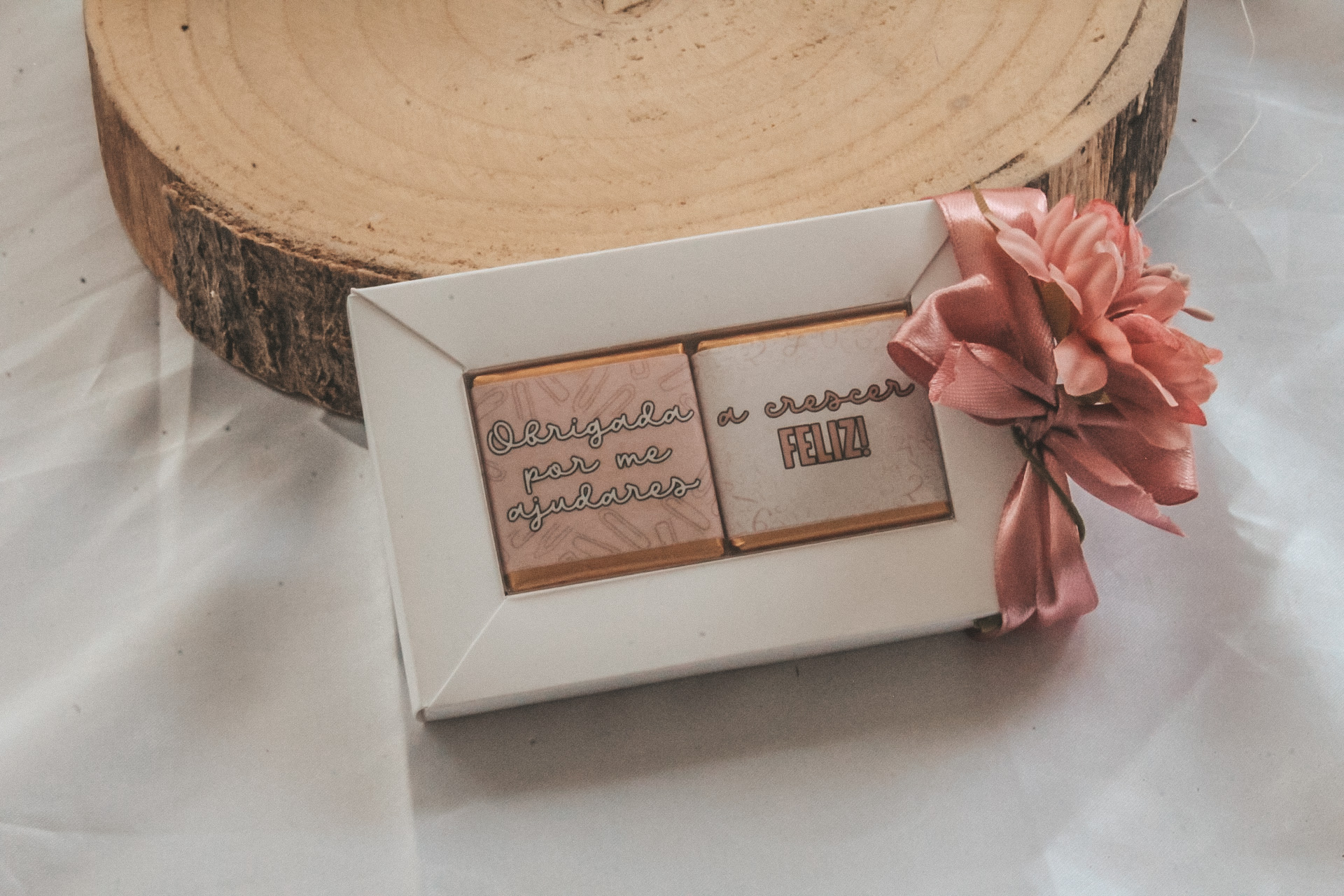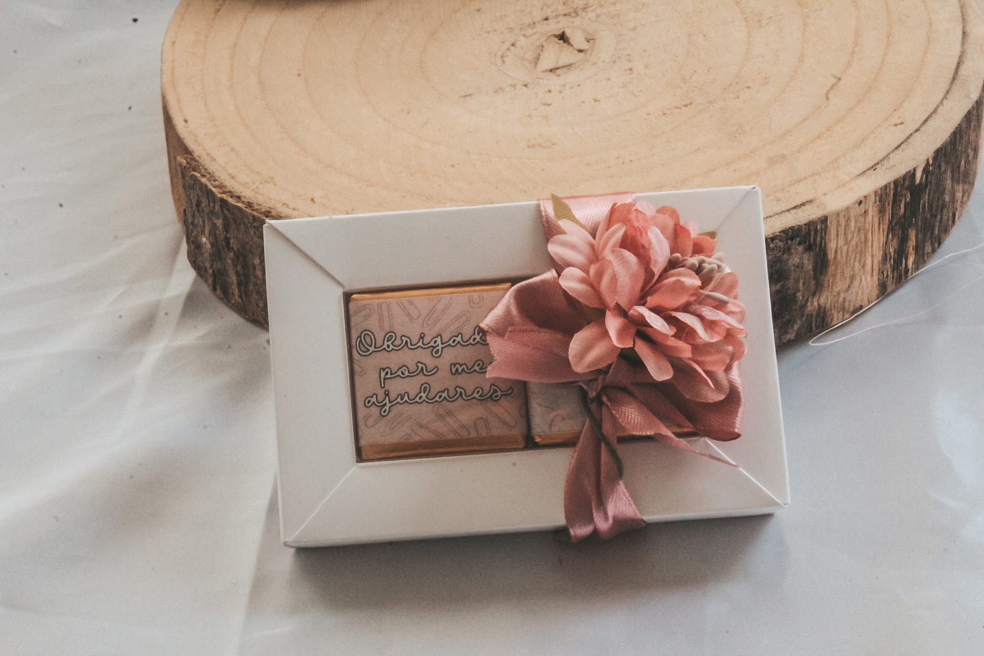 • Caixa branca com etiqueta agradecimento e flor rosa em tecido