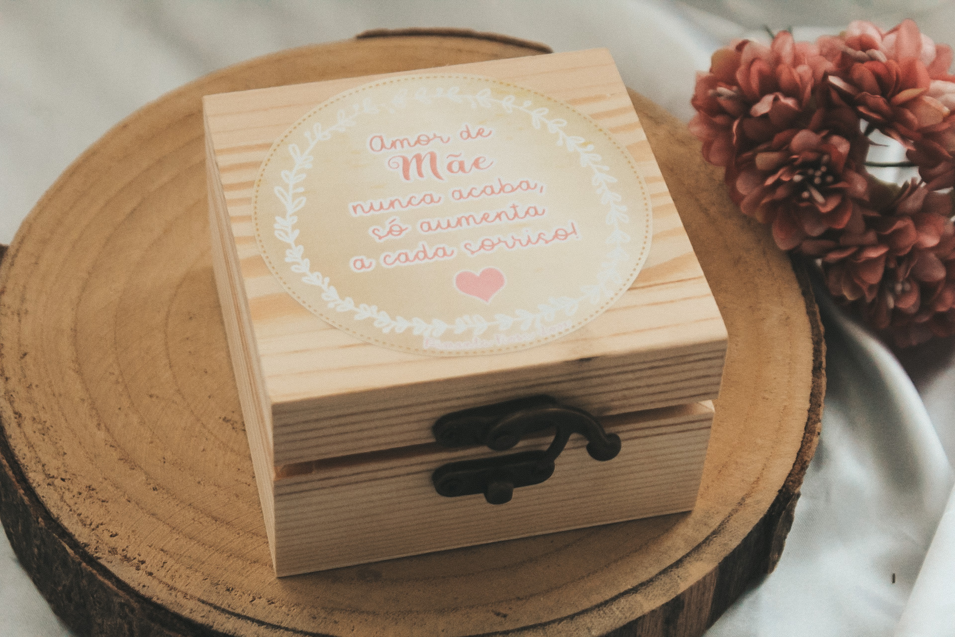 • Caixa de madeira clara com texto e decoração floral sobre base de madeira com flores secas ao lado