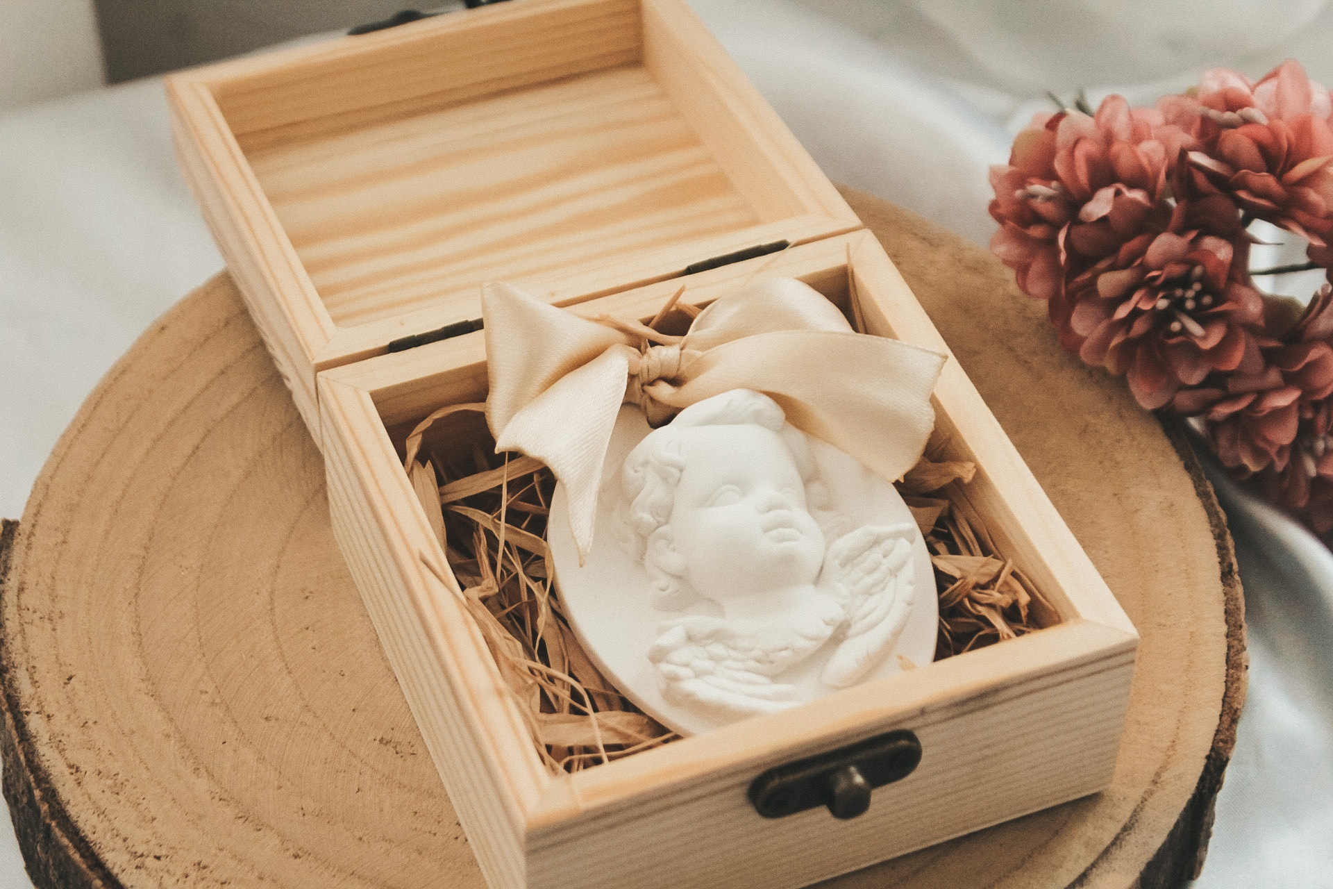 • Medalhão branco com rosto de anjo numa caixa de madeira aberta, com laço bege