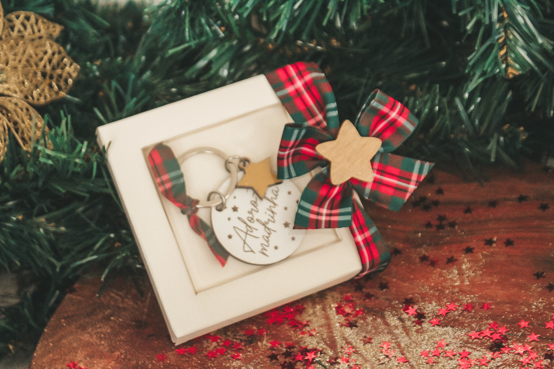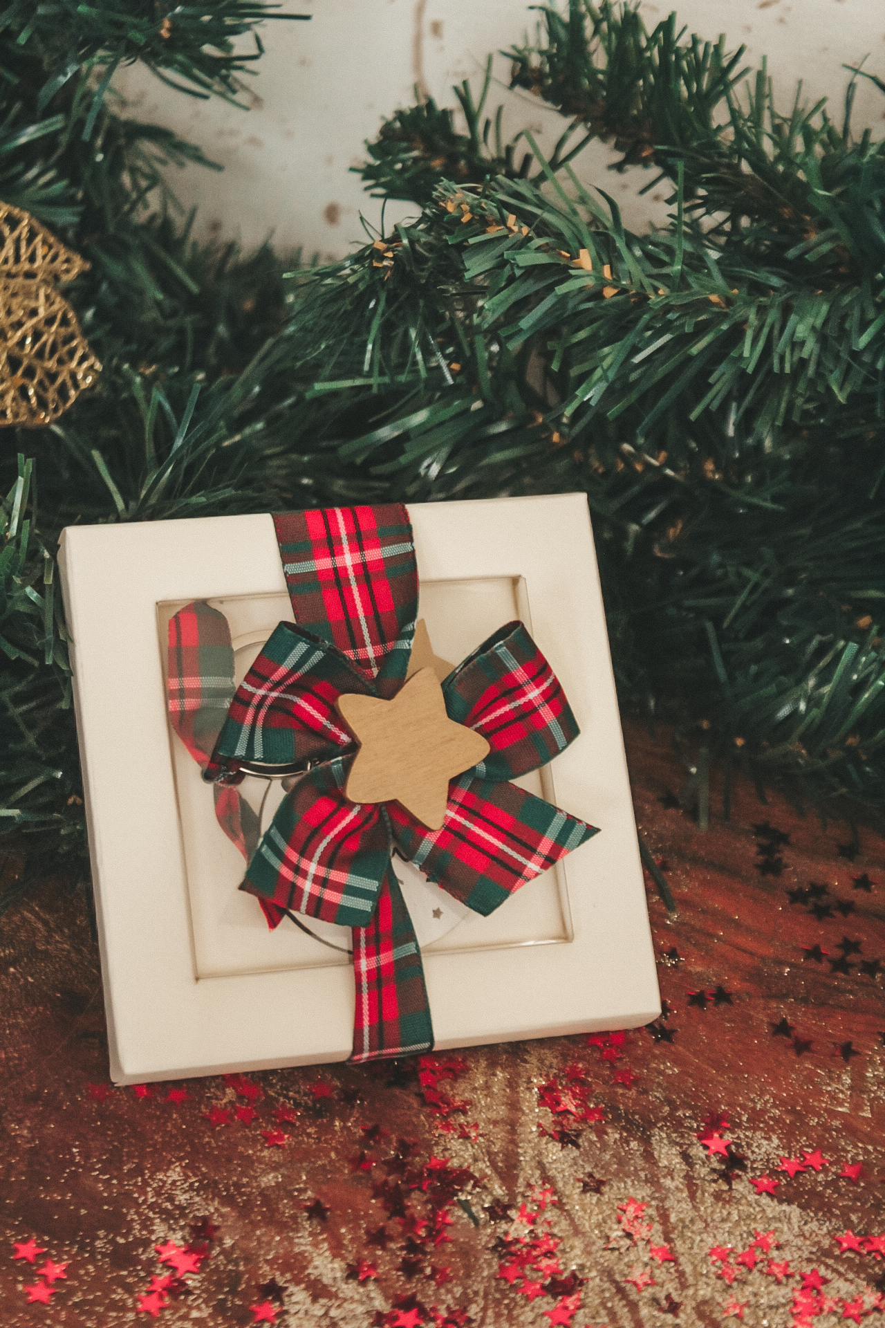 • Caixa branca com laço xadrez e estrela de madeira em fundo festivo