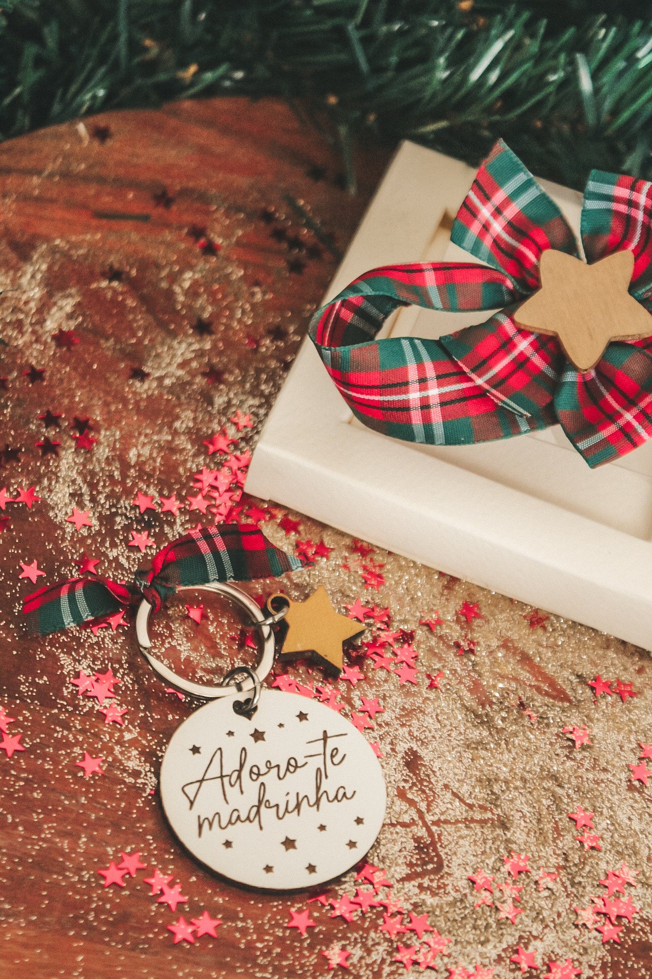 • Chaveiro e caixa decorada com fita xadrez e estrela de madeira em fundo de madeira com glitter e confetes