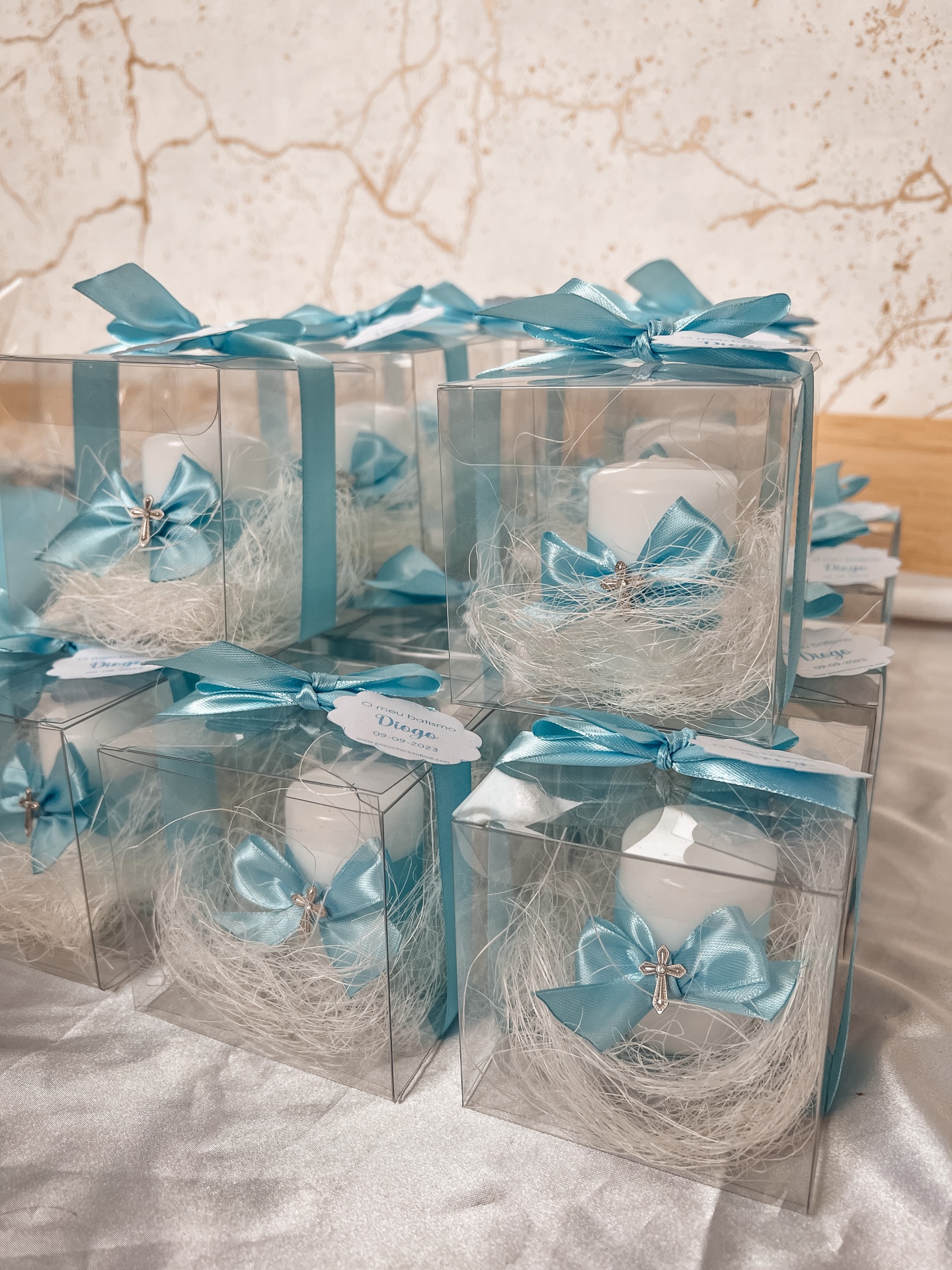 • Conjunto de velas decoradas com laços azuis em caixas transparentes