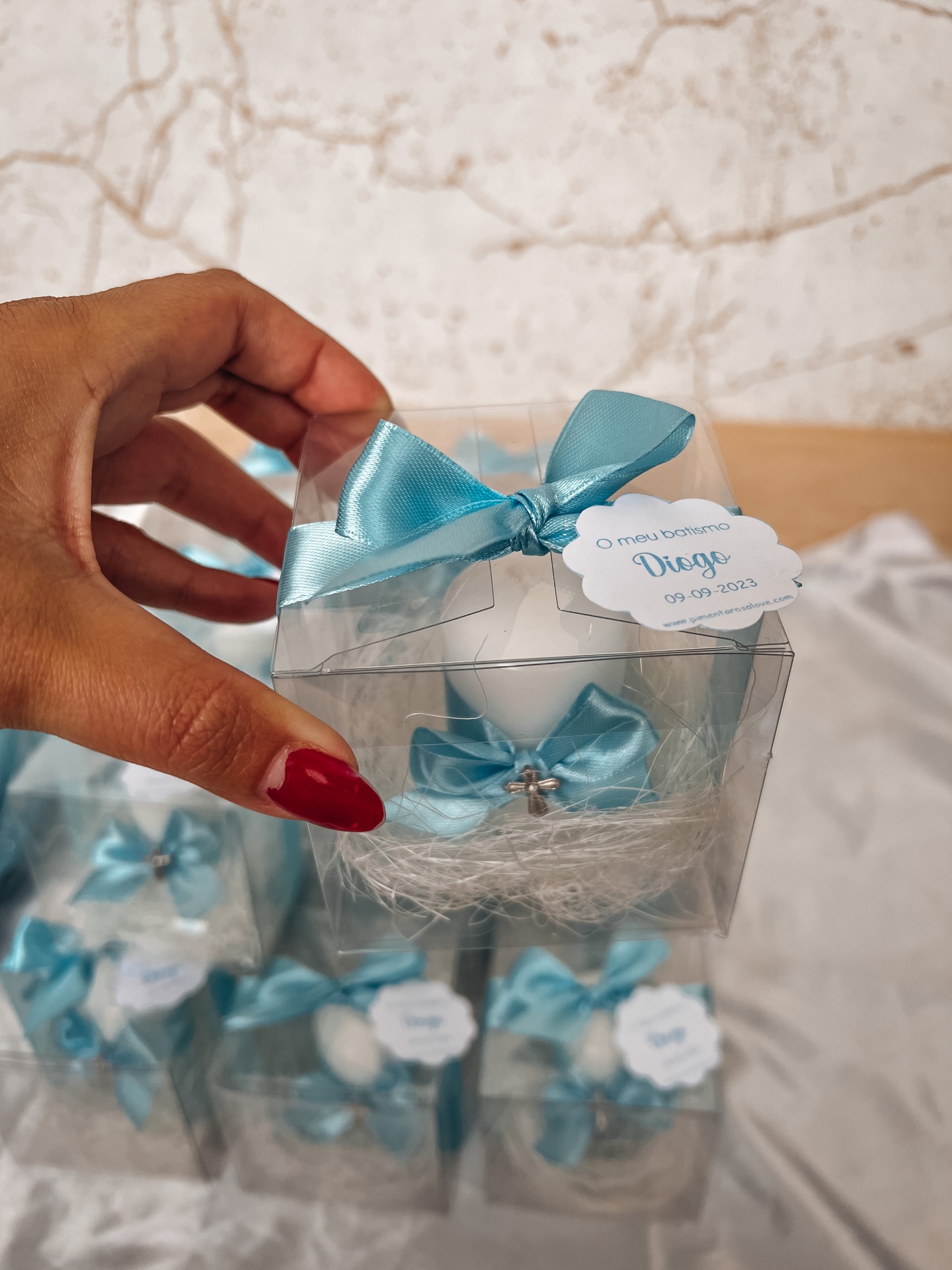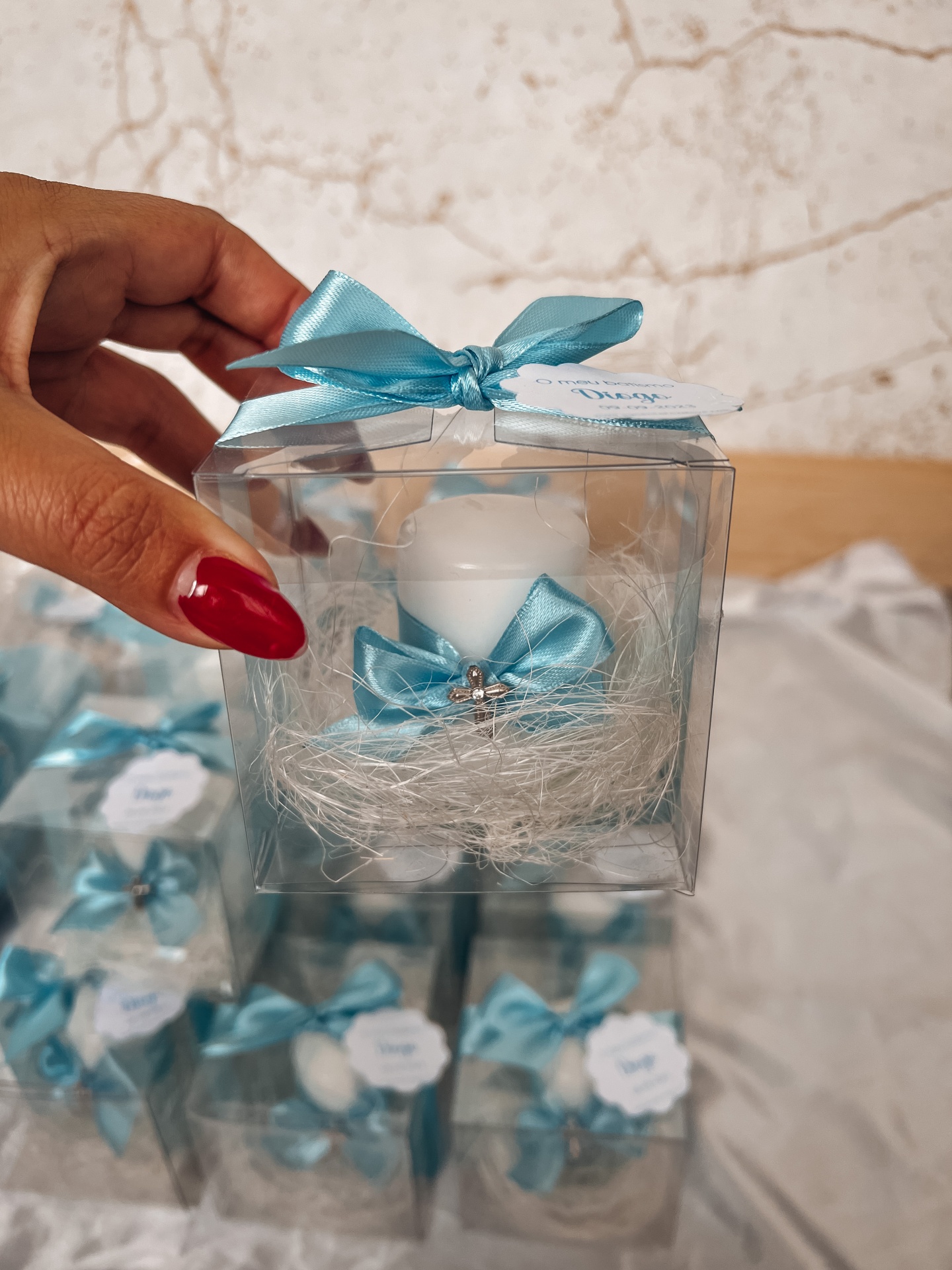 • Velas decorativas brancas em caixas transparentes com laços azuis e cruzes prateadas