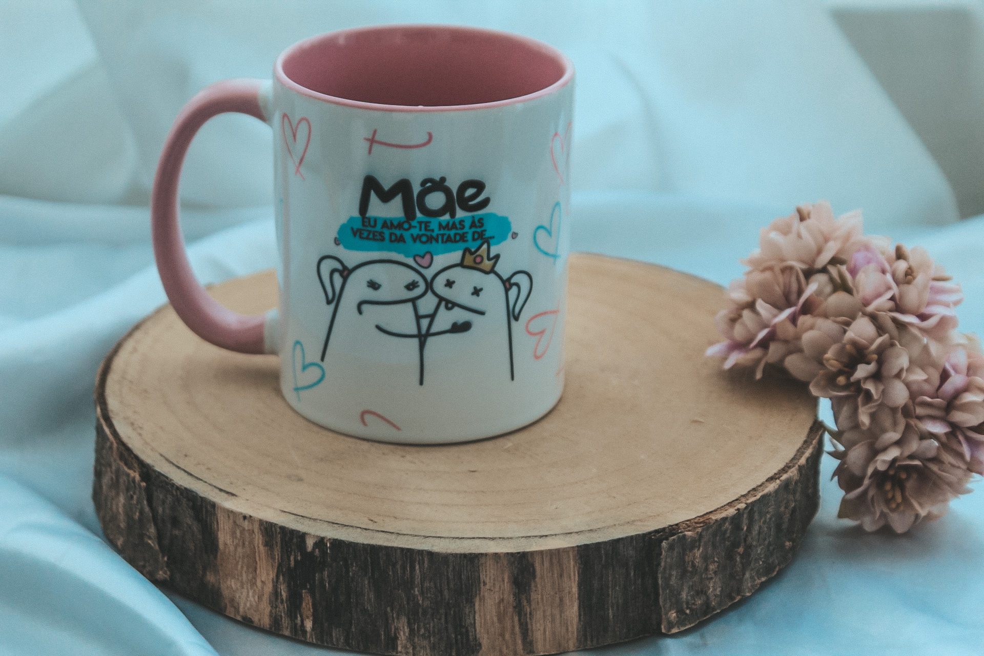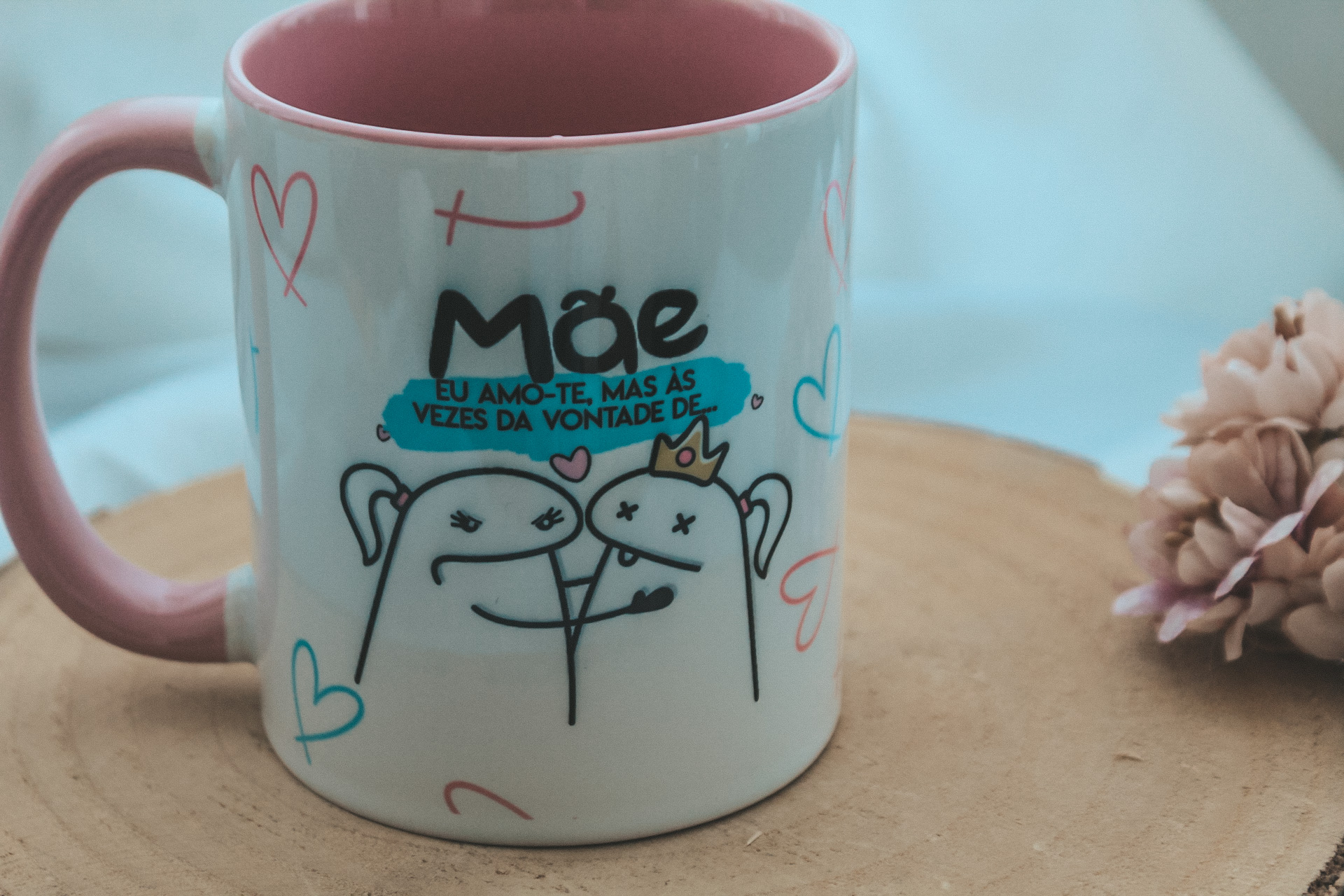 • Caneca branca com desenhos coloridos e texto para mãe, sobre base de madeira, com flores cor-de-rosa ao lado