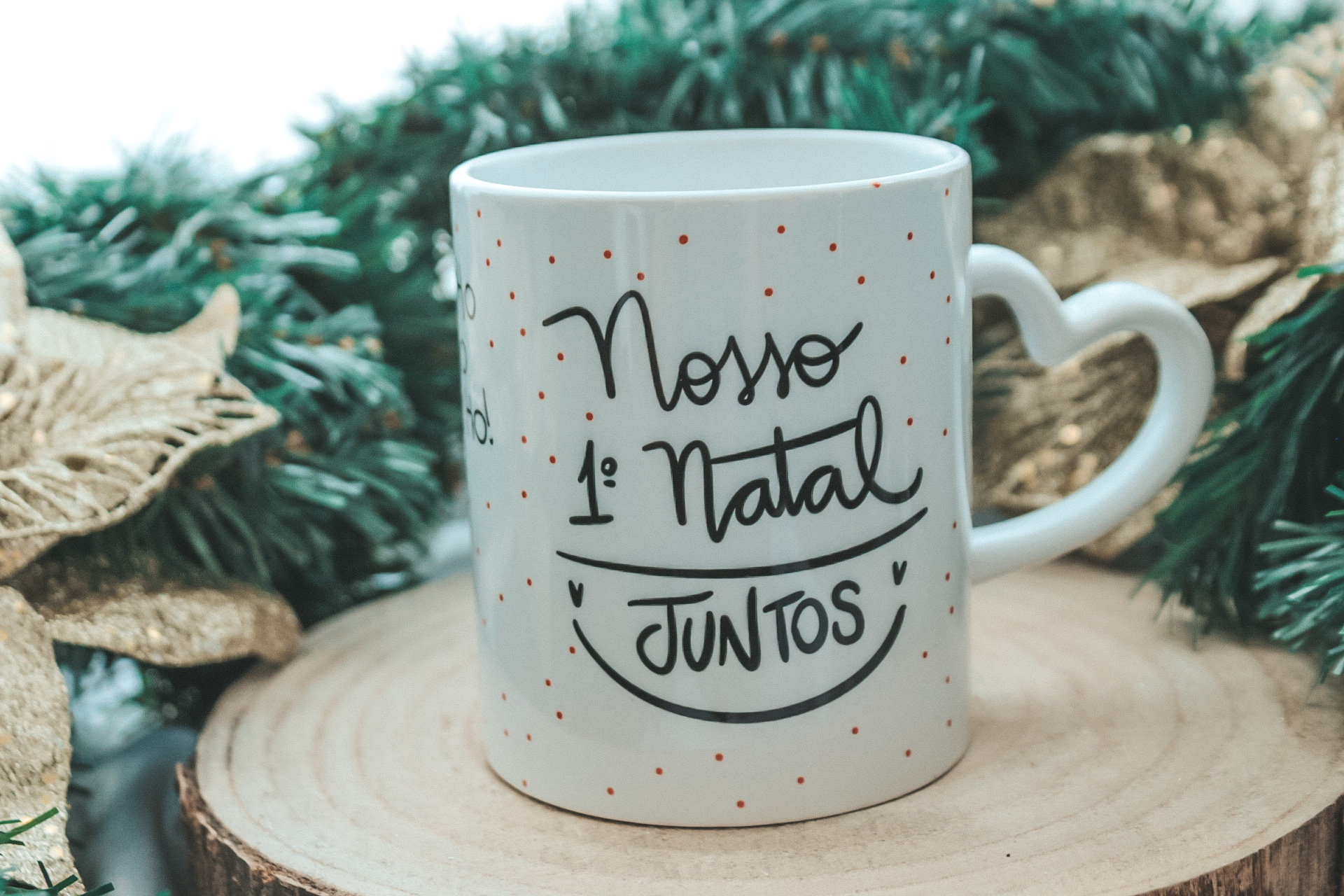 • Caneca de cerâmica branca com desenhos de dois gatos com gorros de Natal vermelhos e alça em forma de coração