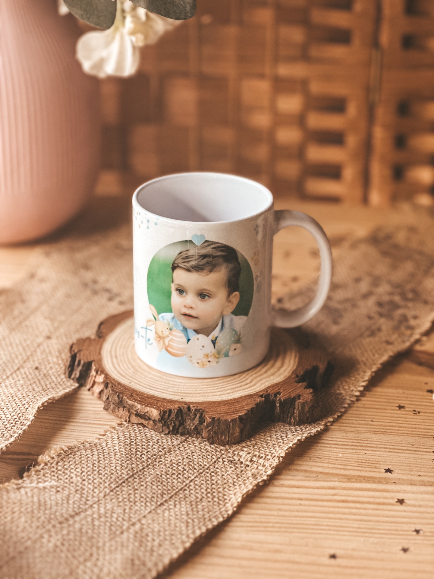 • Caneca personalizada com foto de criança e elementos de Páscoa sobre base de madeira numa mesa rústica