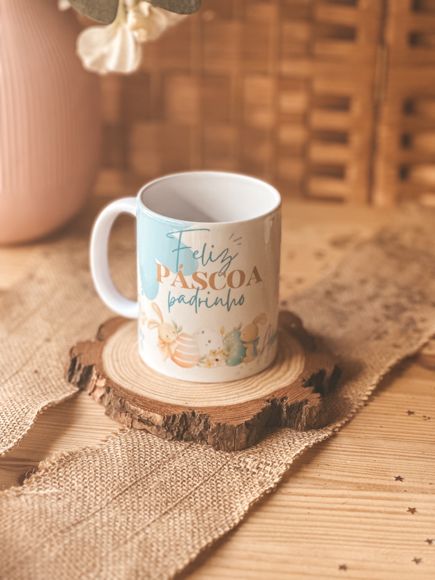 • Caneca de cerâmica decorada com tema de Páscoa sobre base de madeira