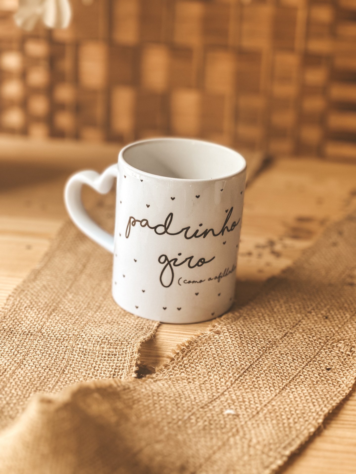 • Caneca branca com texto e pega em forma de coração sobre tecido rústico castanho