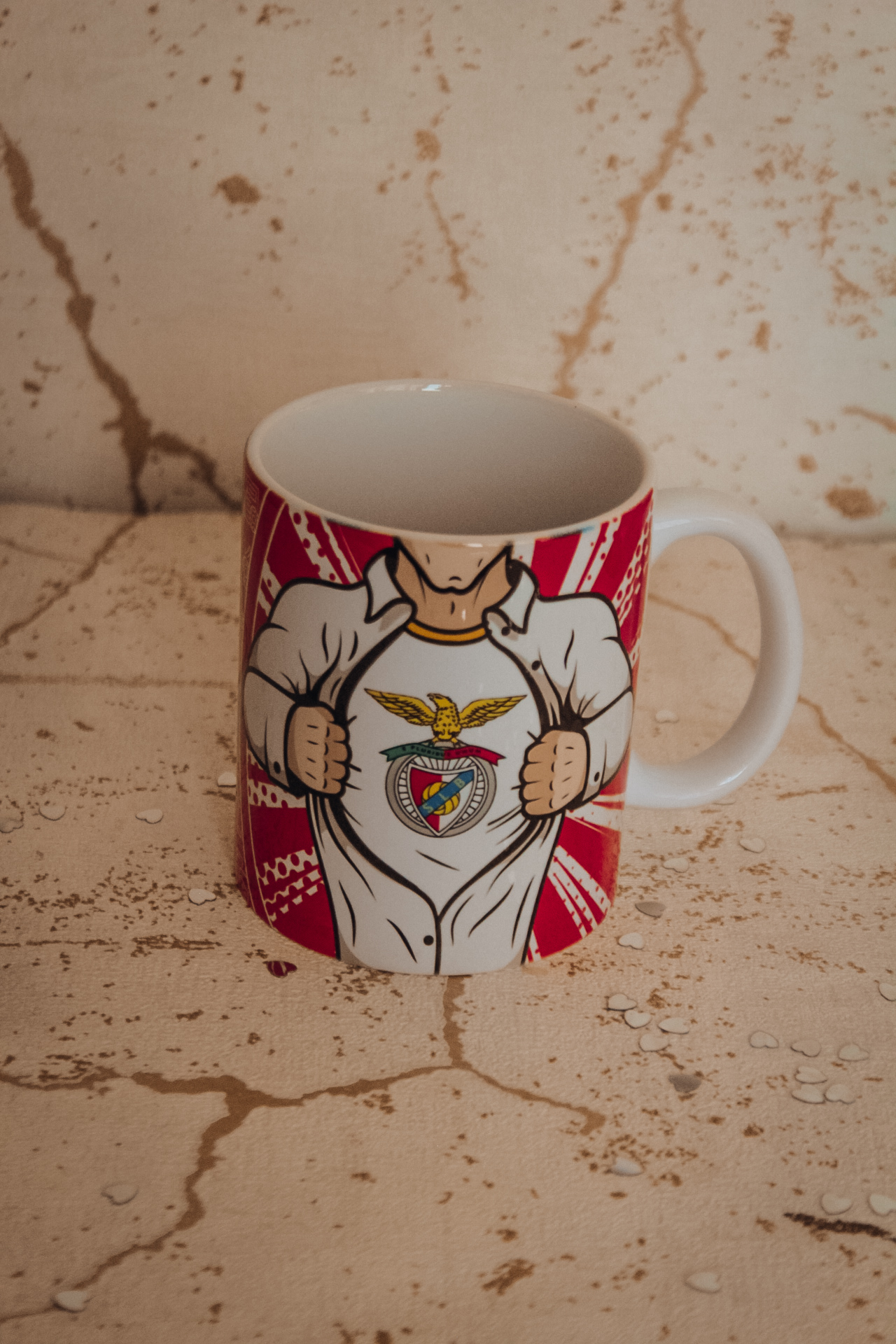 • Caneca branca com alça decorada com personagem a abrir camisa revelando emblema e fundo vermelho