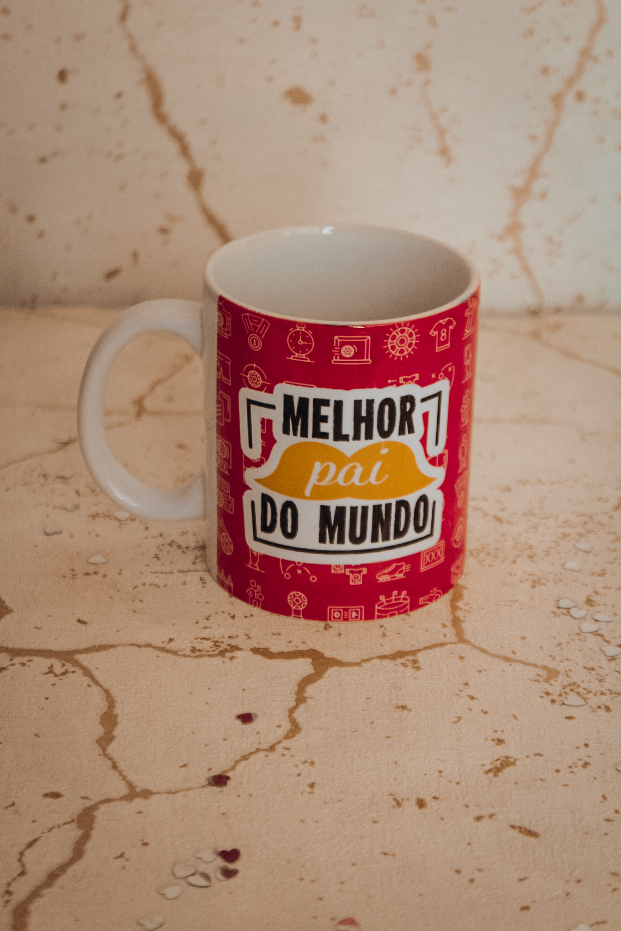 • Caneca branca com corpo vermelho e texto MELHOR pai DO MUNDO em fundo bege