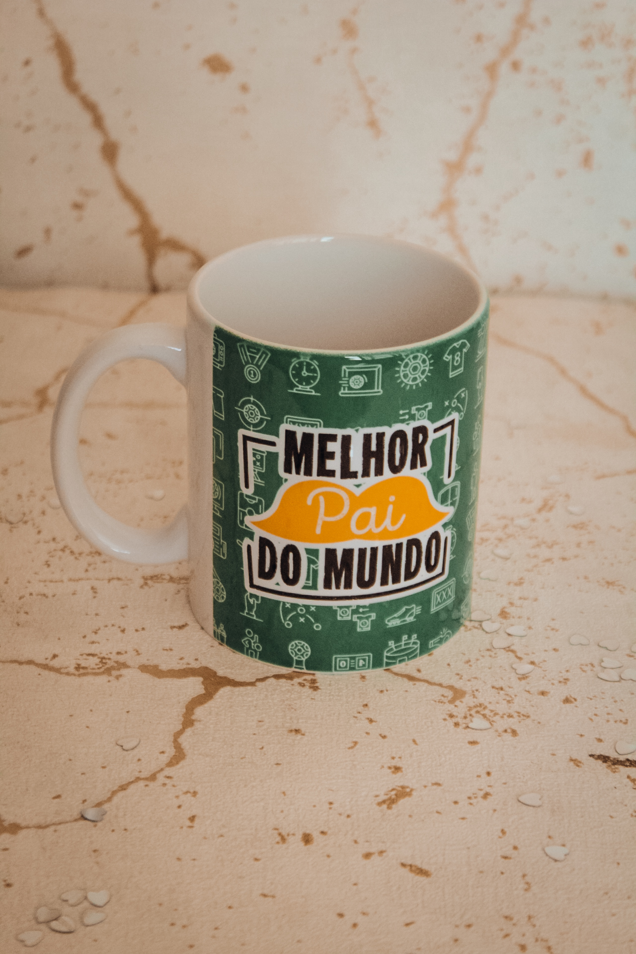 • Caneca branca com mensagem 'Melhor pai do mundo' e fundo verde com ícones brancos