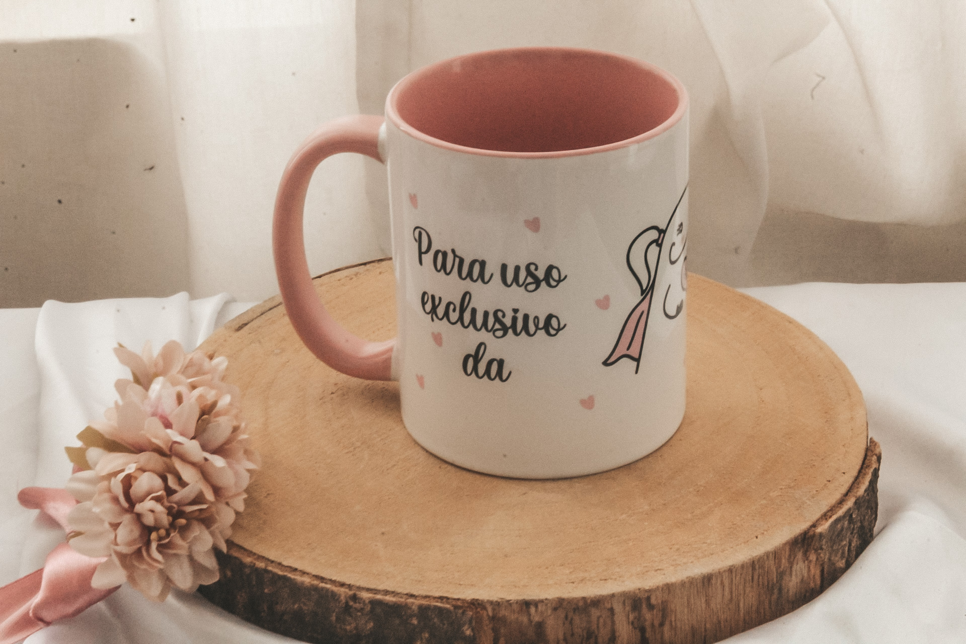 • Caneca branca e rosa com texto e desenho sobre base de madeira com flor rosa