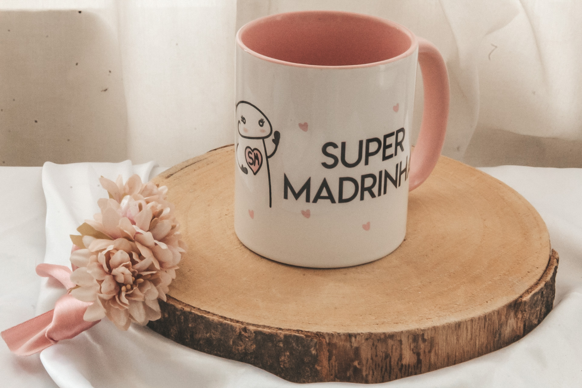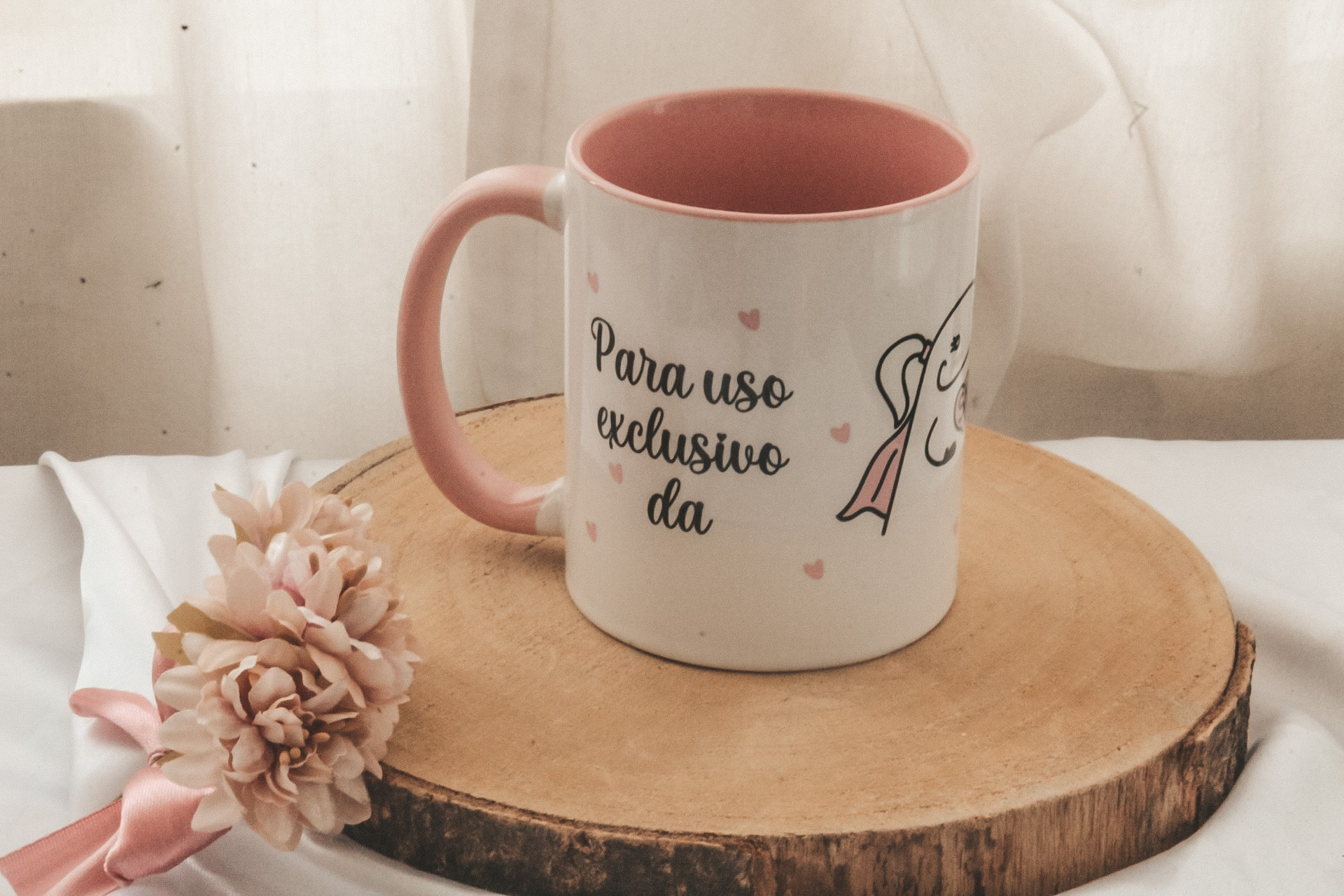 • Caneca branca com interior e pega rosa, texto e corações, sobre base de madeira com flor rosa e tecido branco